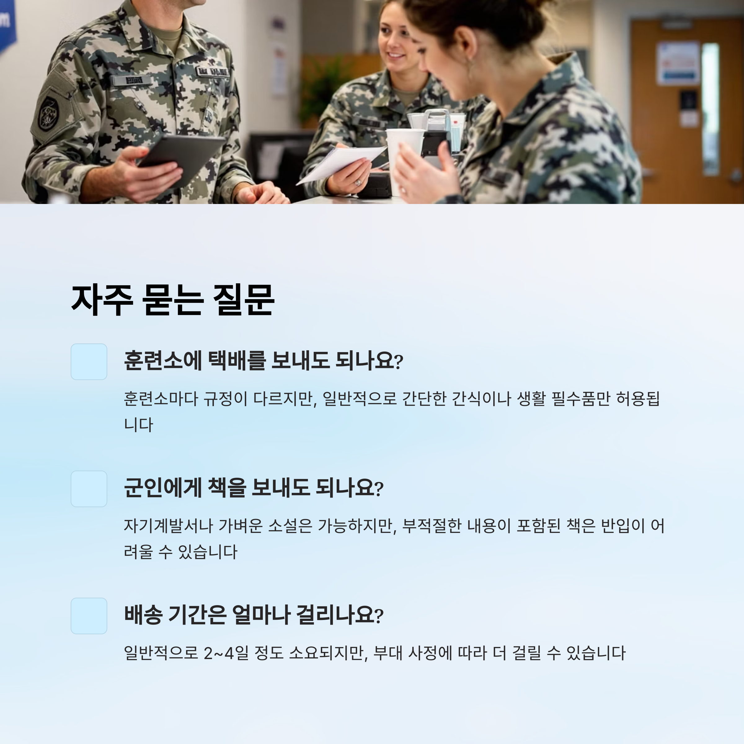 - 🚛 배송 업체 선택: CJ대한통운, 우체국 택배 등 군부대 배송 가능한 업체 이용.