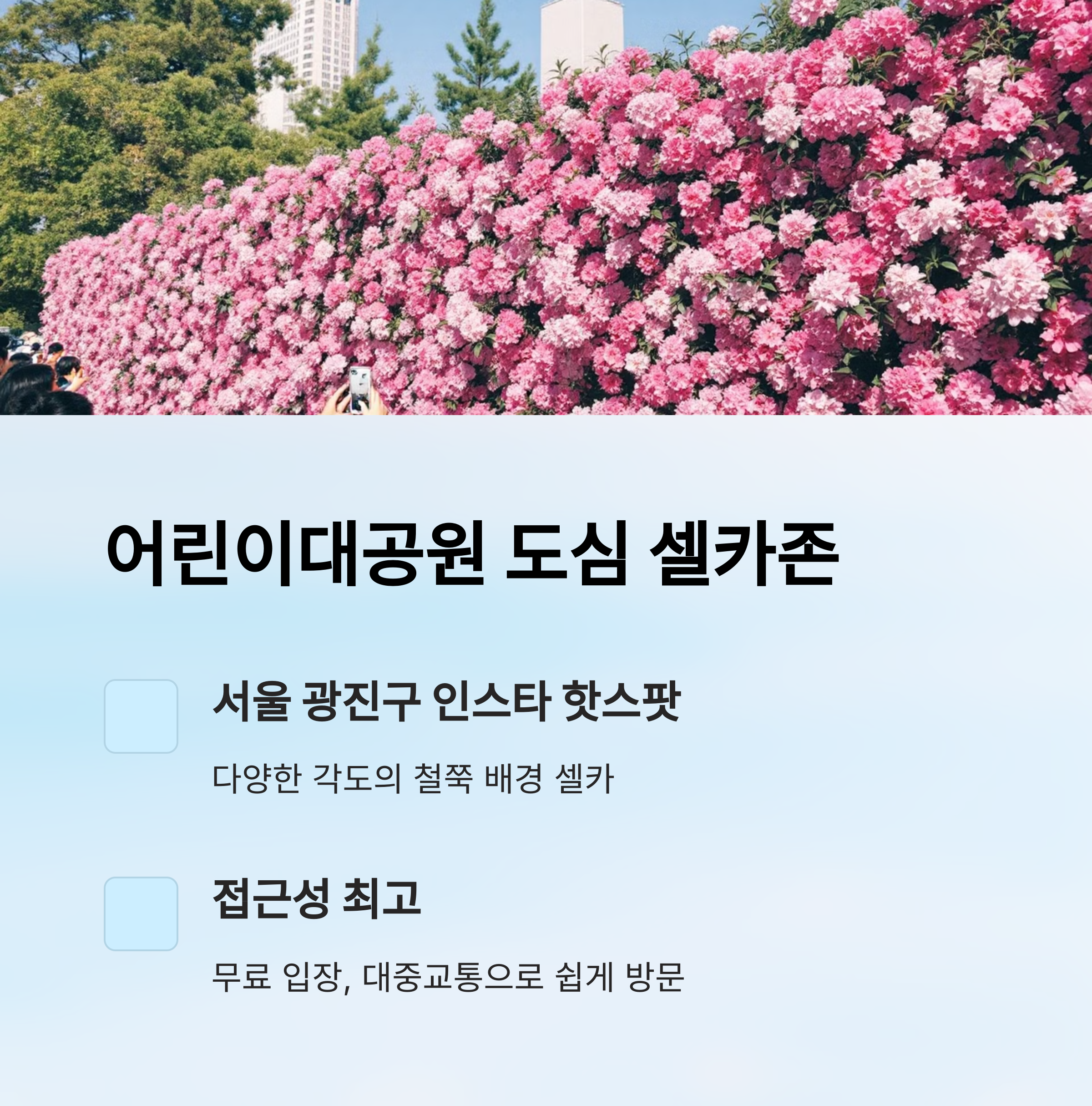서울 광진구 어린이대공원은 도심에서 철쭉을 배경으로 간편하게 찍을 수 있는 최고의 셀카 포인트가 많아요. 특히 입구 오른편 철쭉벽 포인트는 분홍빛 벽처럼 보이는 군락지로 셀카 맛집이에요! 📱