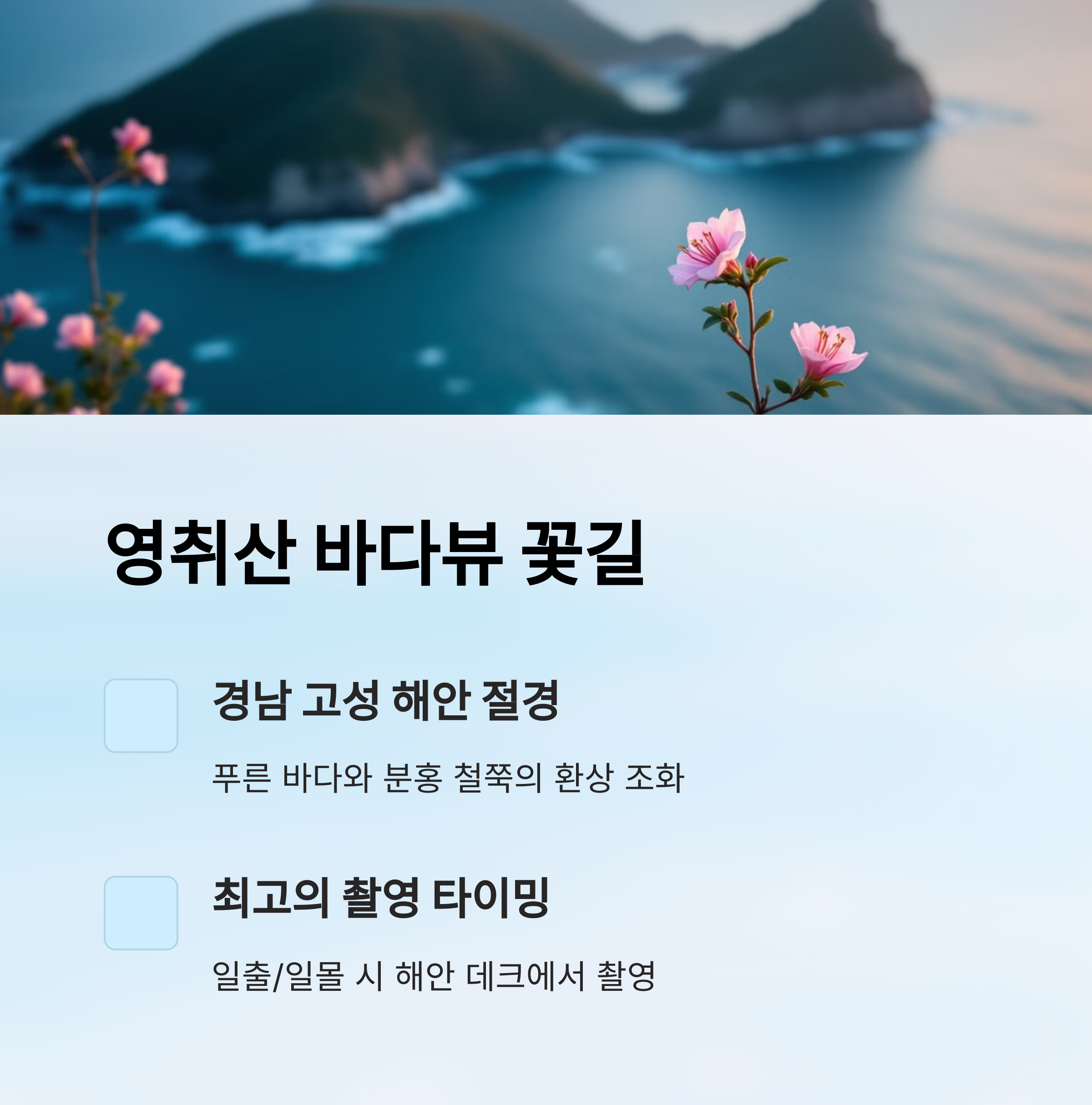 전남 여수 영취산은 바다를 배경으로 철쭉을 담을 수 있는 전국 유일 뷰를 자랑해요. 특히 철쭉언덕 위에서 바다를 등지고 서면 분홍과 파랑이 한 컷에 담기는 마법 같은 장면이 나와요. 🌺🌊