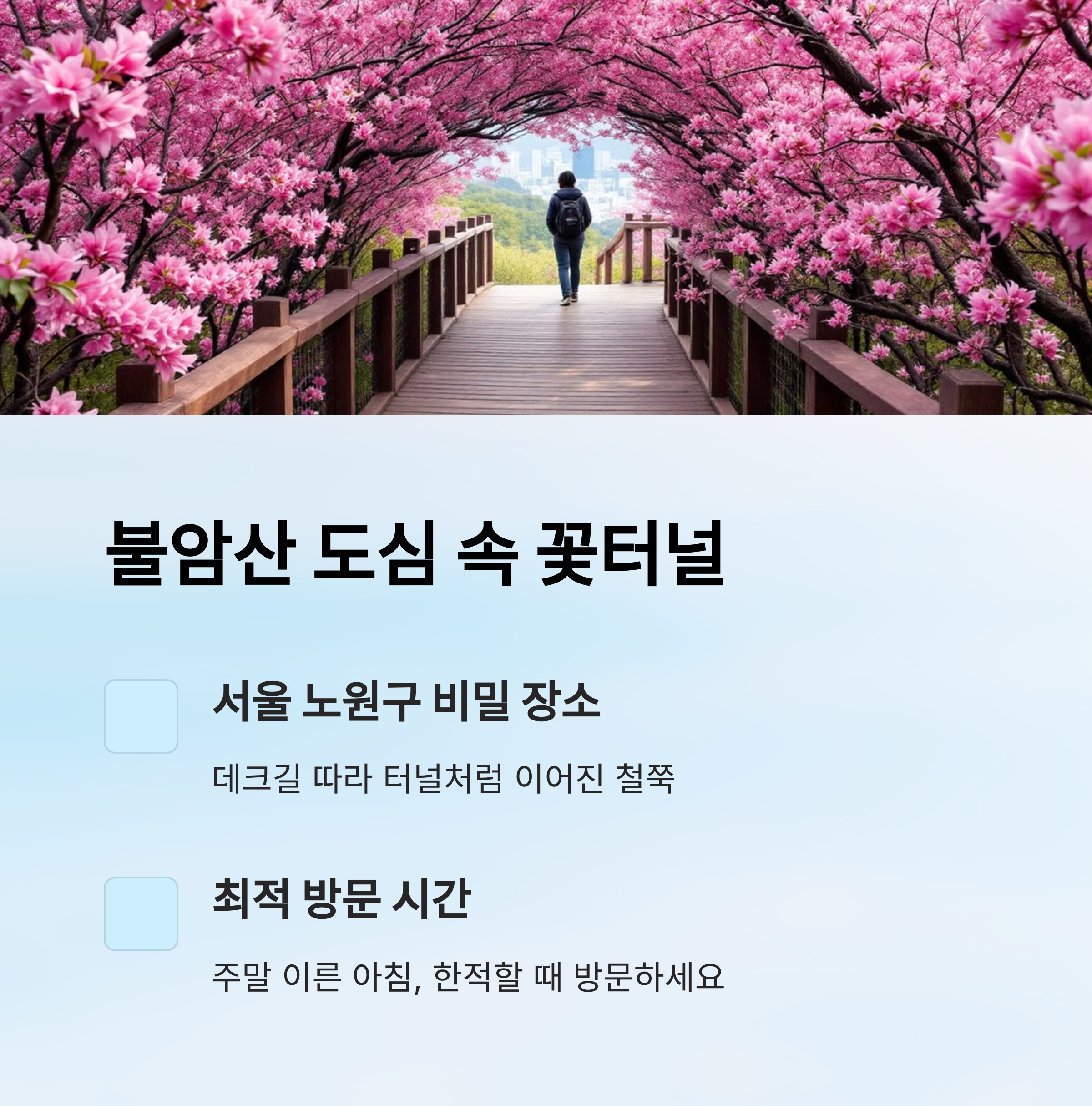 서울 노원구 불암산 둘레길은 낮은 데크길 위로 철쭉이 자연스럽게 아치형을 만들어요. 마치 분홍 터널 안을 걷는 느낌이 들고, 셀카도 정면샷도 아주 예쁘게 나오는 장소예요. 🌷
