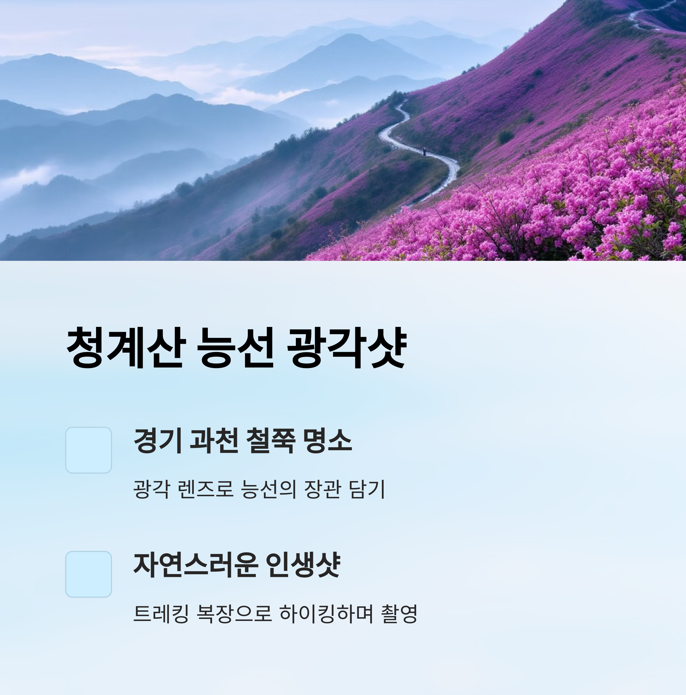 서울 근교 등산지로 인기인 청계산 매봉 능선은 철쭉이 피는 봄이면 산행 중 광활한 철쭉능선이 펼쳐져요. 이곳은 인물보다 풍경 비중이 큰 사진을 원할 때 최고예요. 드론샷 감성도 가능하죠! 🚁