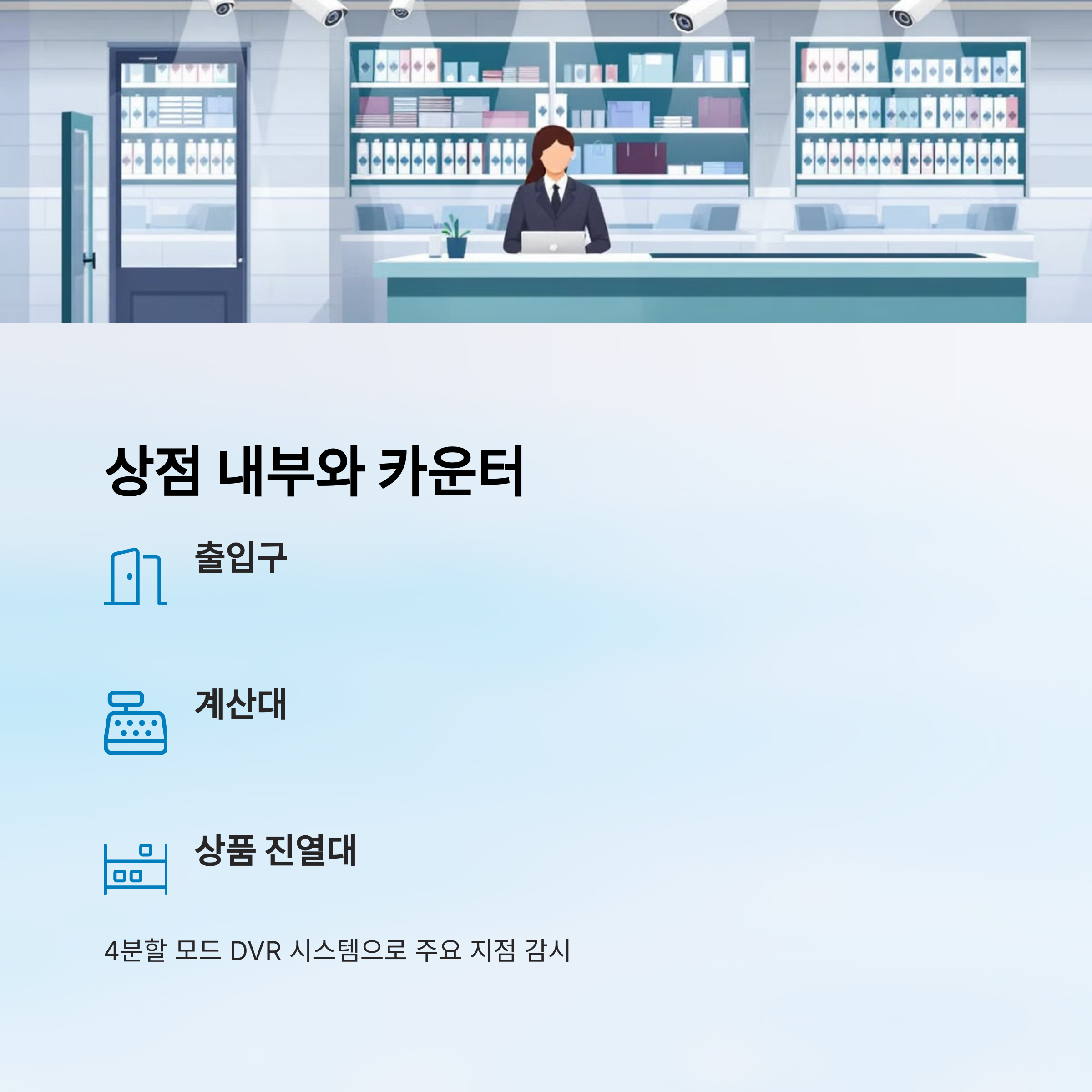 상점이나 편의점, 식당 같은 매장 내부에서는 도난 방지와 계산대 보안을 위해 CCTV 설치가 매우 중요해요. 특히 매출이 오가는 카운터는 고객 응대 중 발생할 수 있는 분쟁까지 대비해야 하므로, 카메라 위치 선정이 핵심이에요.