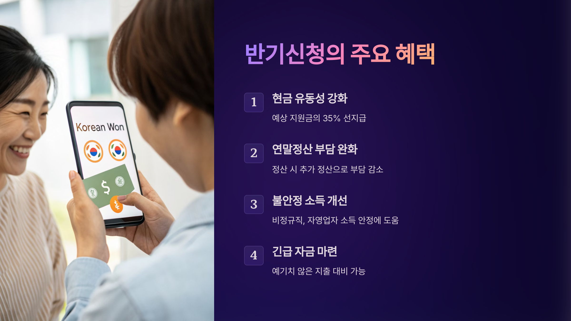 또한 연말정산 시점에 전체 금액을 기다리지 않아도 돼요. 반기신청을 통해 이미 일부 지원금을 받은 상태이기 때문에, 연말정산 때 예상치 못한 큰 금액을 추가로 수령하거나, 과소 지급되는 위험을 줄일 수 있어요.