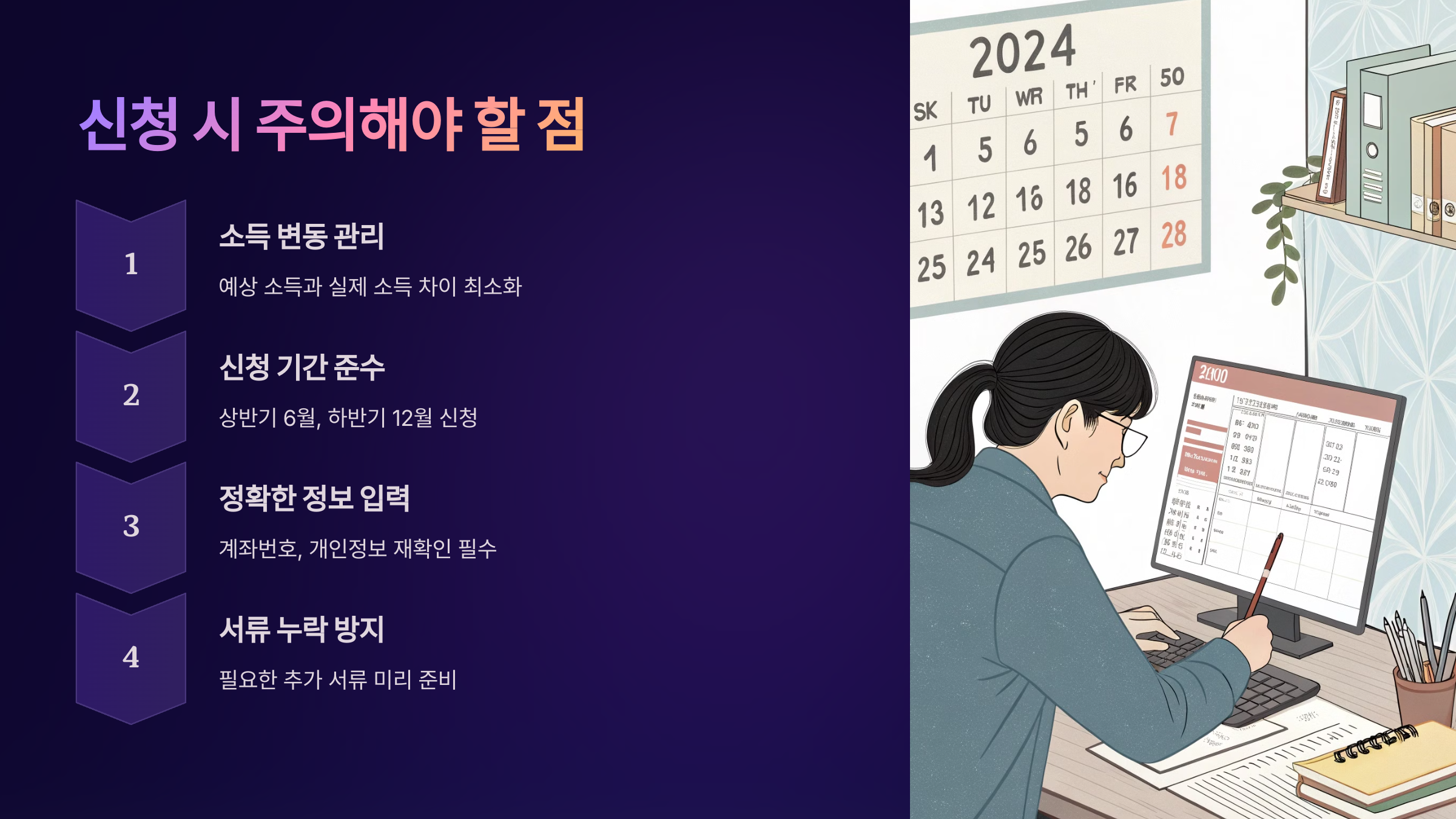 첫째, 소득 변동에 주의해야 해요. 반기신청은 예상 소득을 기준으로 지급되기 때문에, 실제 소득이 예상과 다를 경우 지급액이 달라질 수 있어요. 만약 소득이 감소했다면 다음 정산 시 추가 지원금을 받을 수 있지만, 소득이 늘었다면 환수될 수도 있어요.