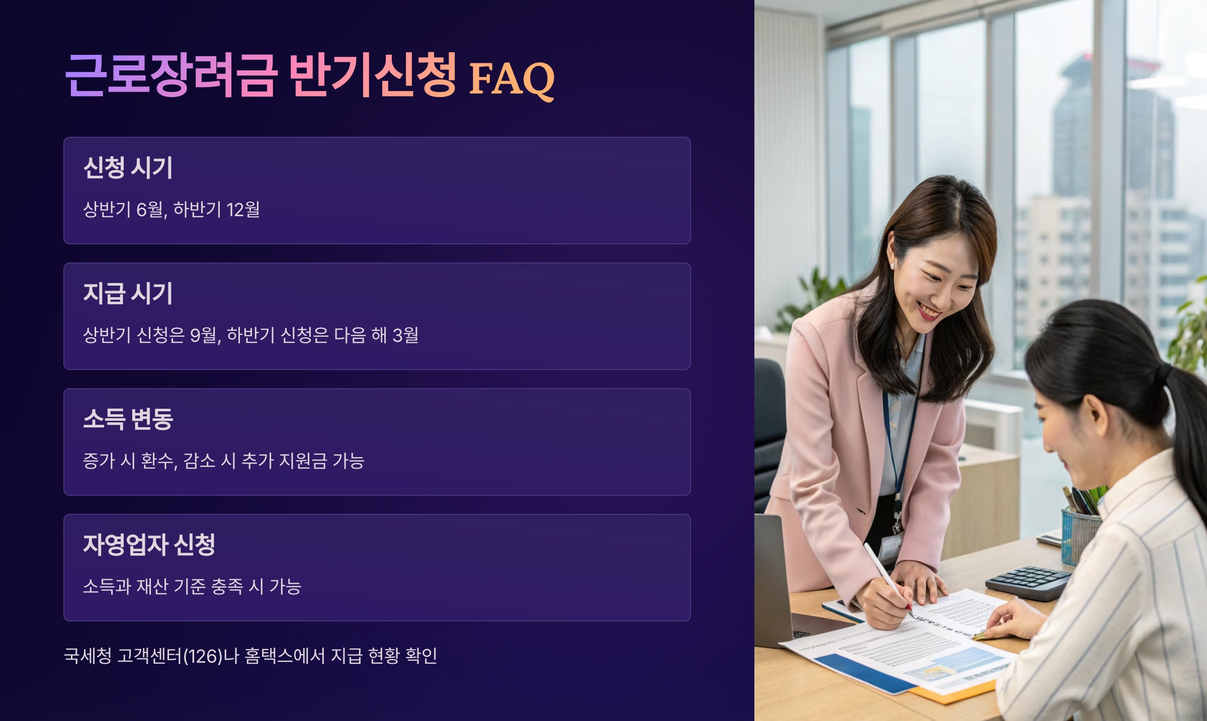 또한, 반기신청으로 일부 근로장려금을 미리 받았다면 연말정산 때 정산 과정을 통해 남은 금액을 추가로 받을 수 있어요. 만약 소득이 감소했거나 재산이 줄었다면 추가 지원금이 나올 가능성도 있어요.