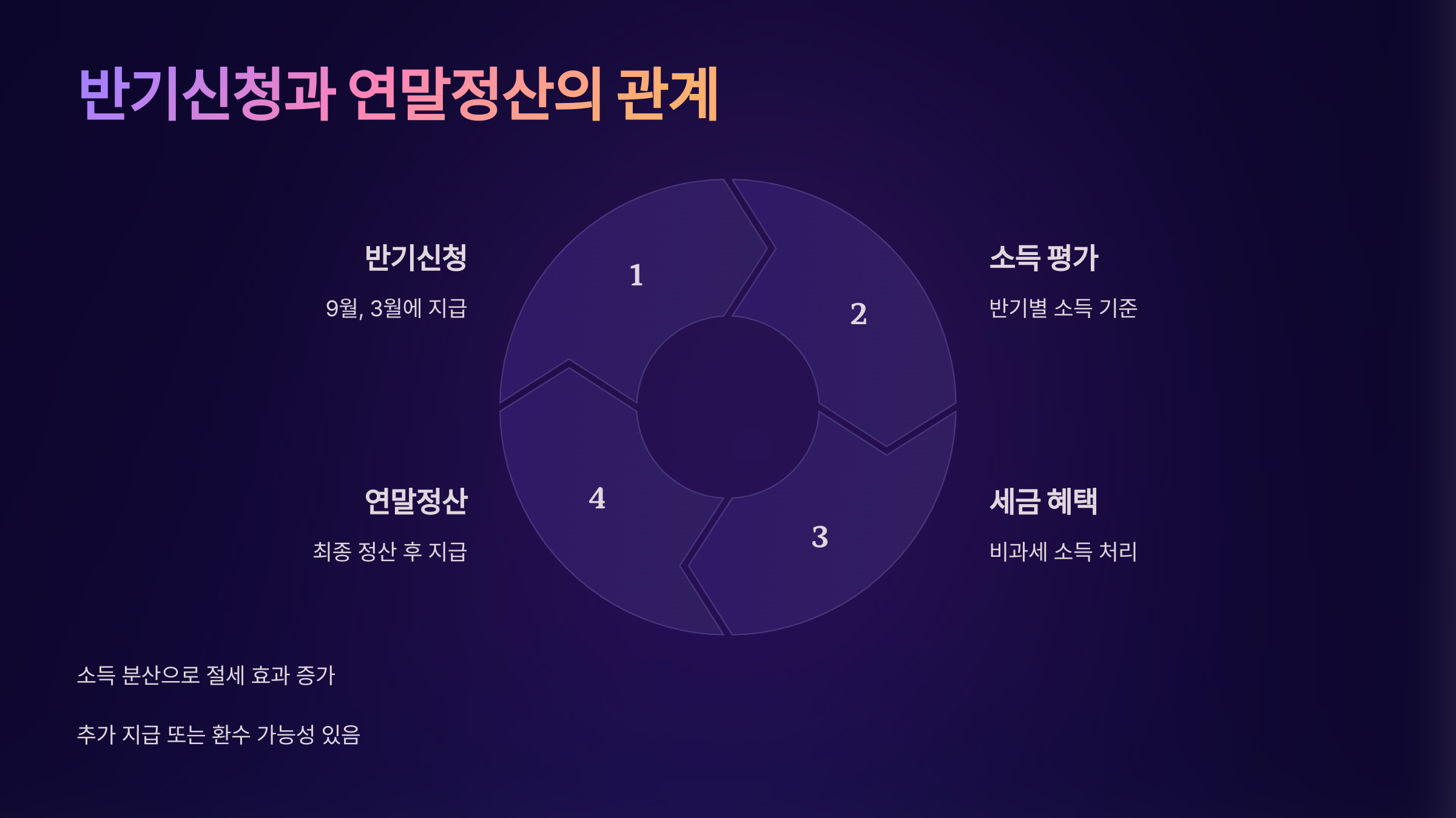 반기신청을 통해 연말정산 시 불필요한 세금 부담을 줄일 수 있어요. 특히 소득이 일정하지 않은 분들에게는 소득을 분산시켜 절세 효과를 높이는 좋은 방법이에요. 👍