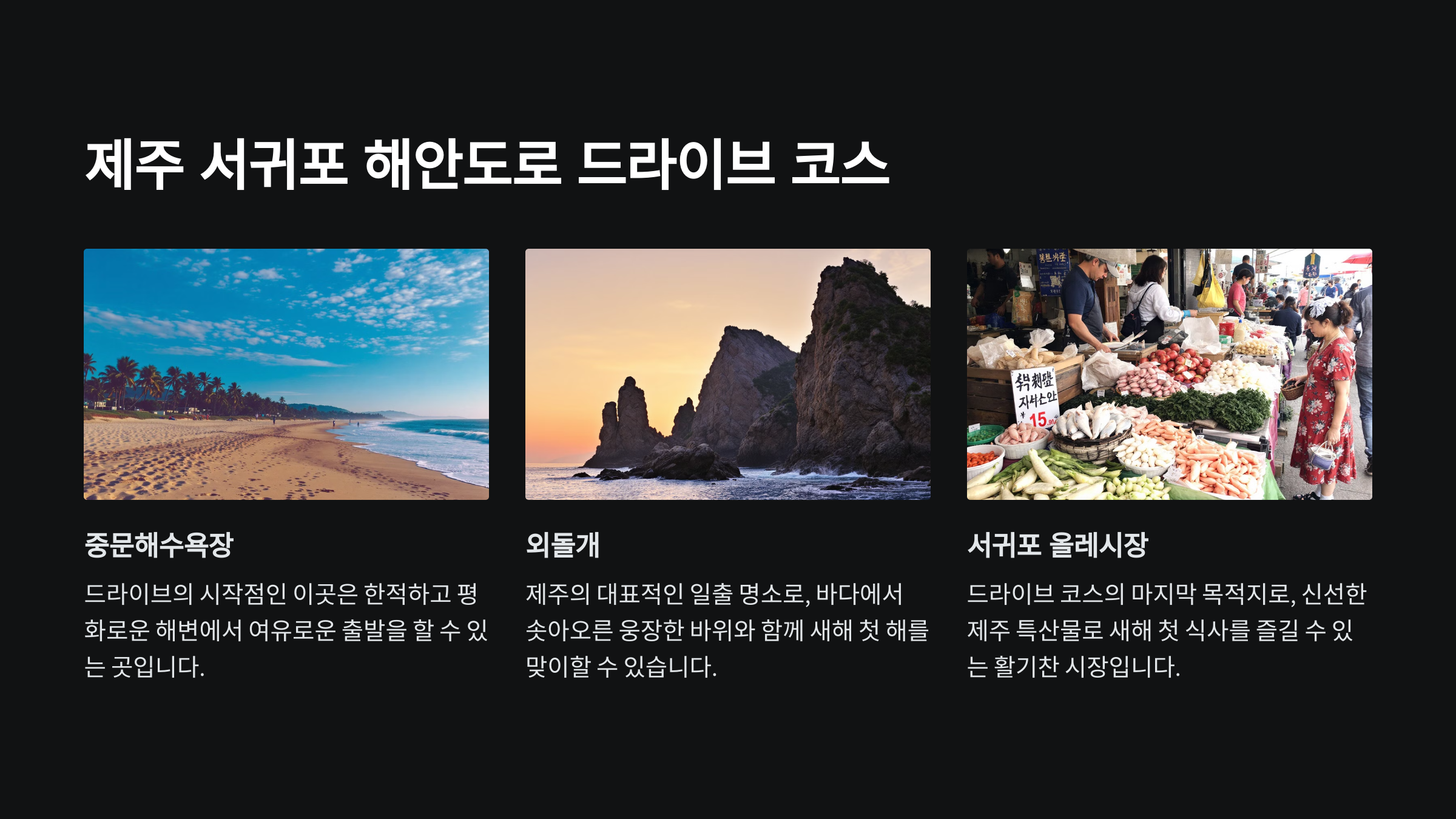 - 추천 코스: 중문해수욕장 → 외돌개 → 서귀포 올레시장