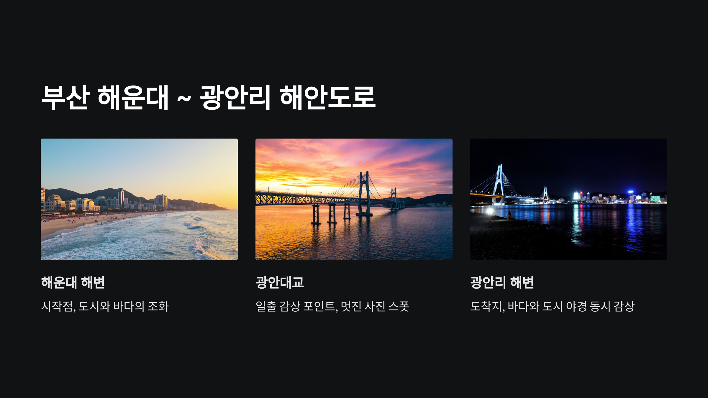 - 추천 코스: 해운대 해변 → 광안대교 → 광안리 해변