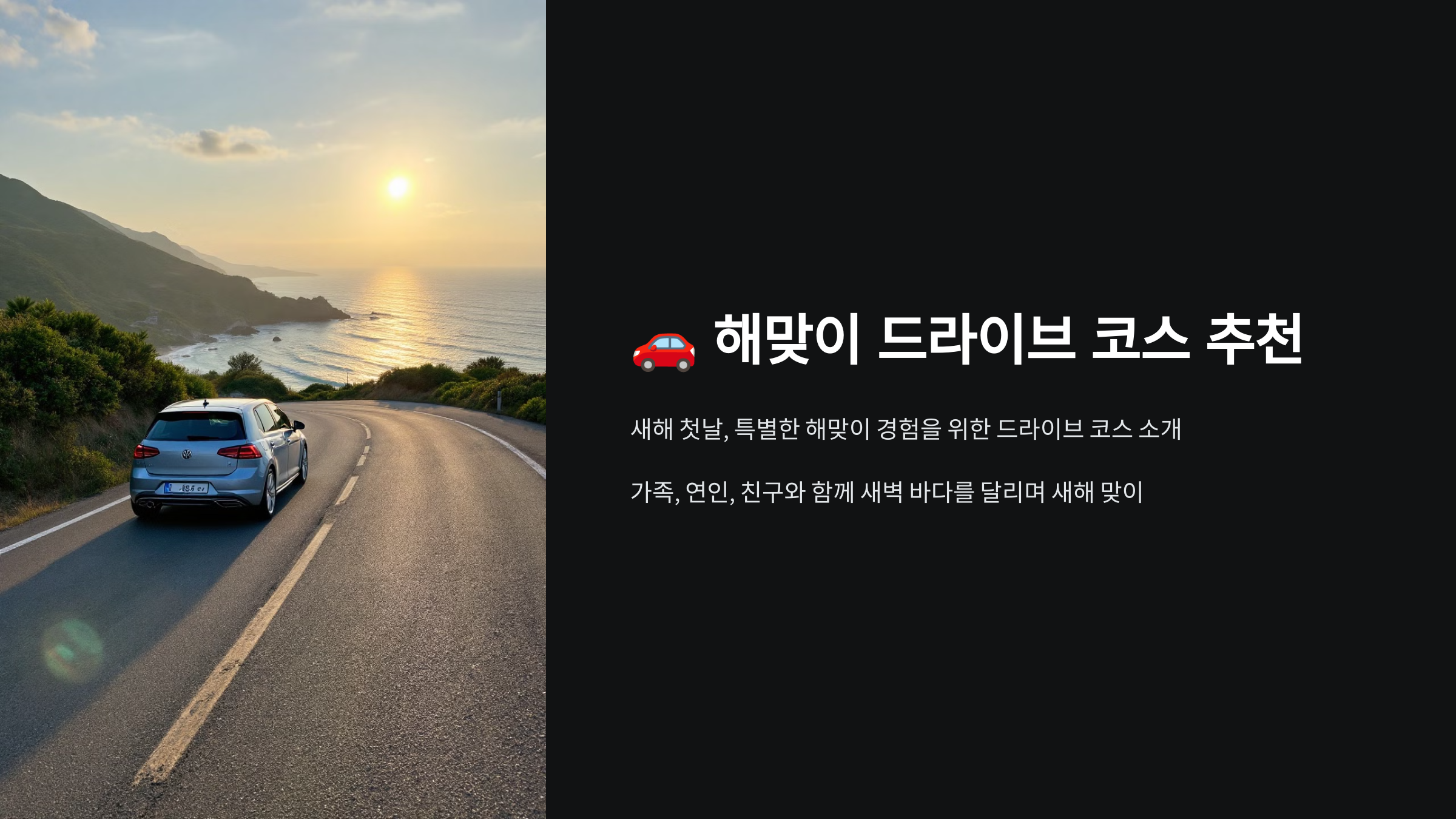 해맞이 드라이브는 단순한 일출 감상이 아니라, 바다와 자연을 함께 느끼며 새해를 맞이할 수 있는 특별한 방법입니다. 가족, 연인, 친구와 함께 드라이브를 즐기며 떠오르는 태양을 바라보며 소중한 추억을 만들어보세요. 새해 첫날의 에너지가 가득 차오를 것입니다. 🌟