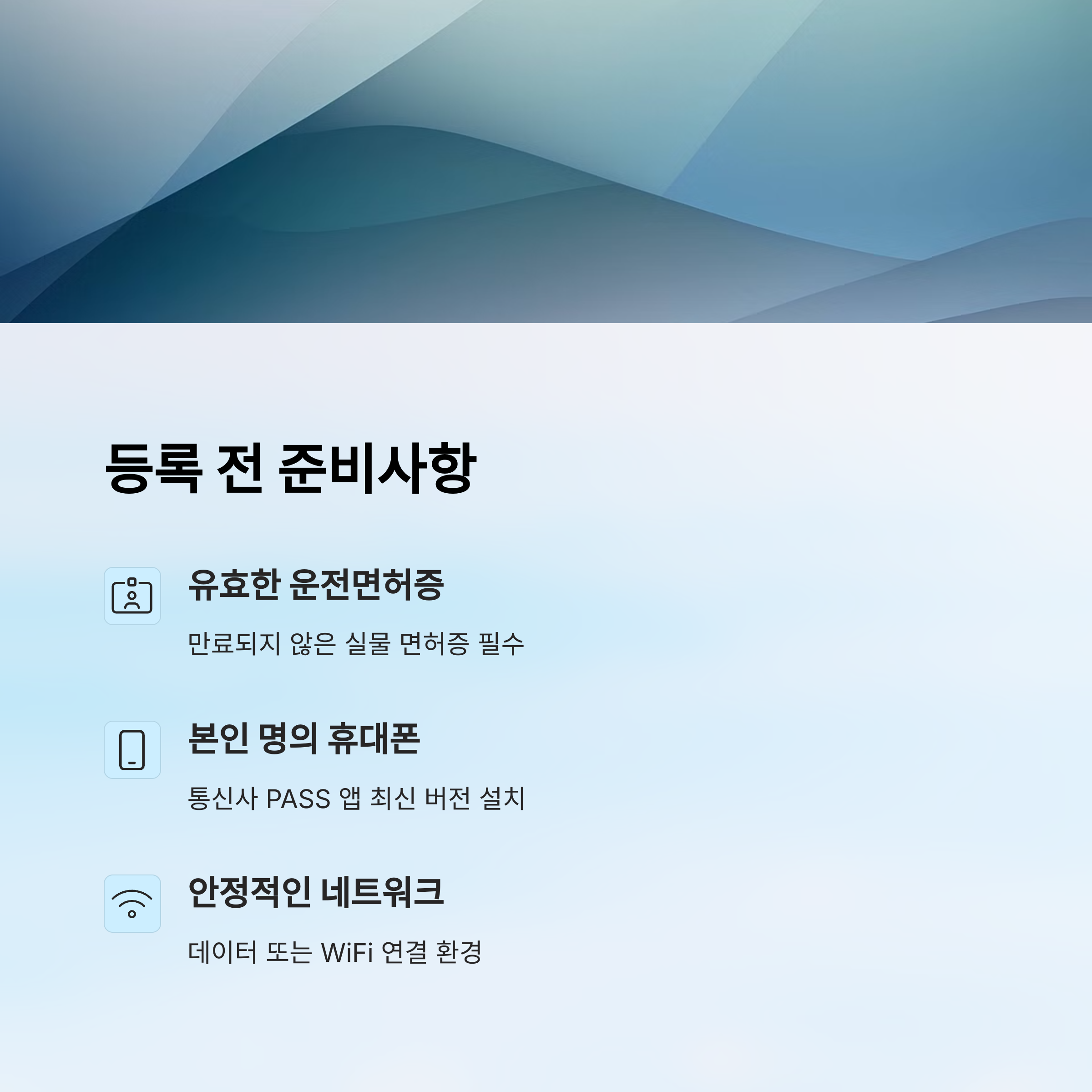 2️⃣ 실물 운전면허증 : 등록 시 카메라로 촬영하여 인증 절차를 거쳐요. 면허증이 없으면 등록이 불가능해요.