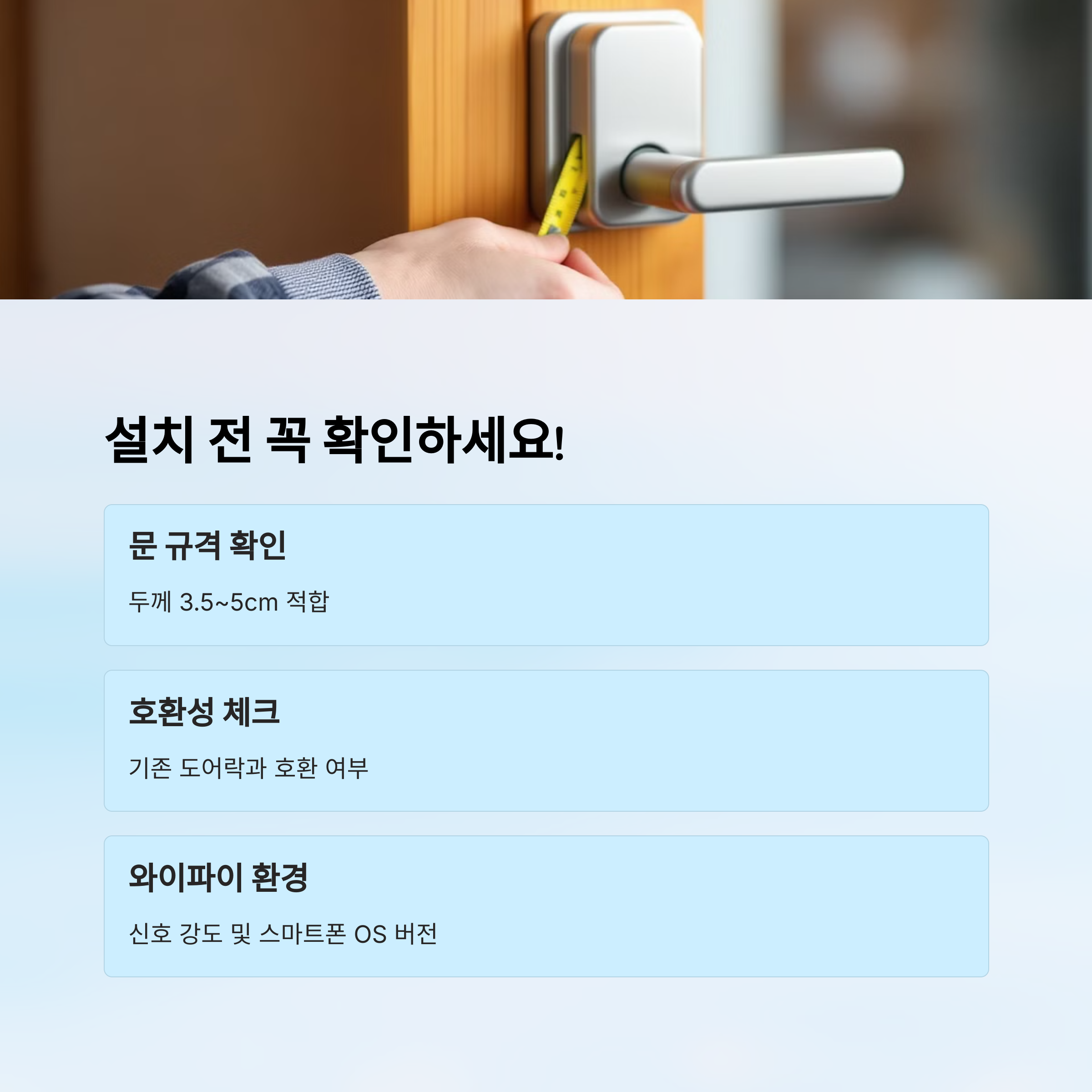 스마트 도어락도 설치 전에 몇 가지를 체크하지 않으면 문제가 생길 수 있어요. 특히 문 구조나 전원 방식 등은 미리 확인하지 않으면 설치 자체가 어려울 수 있거든요. 아래 항목은 필수 체크 포인트예요.