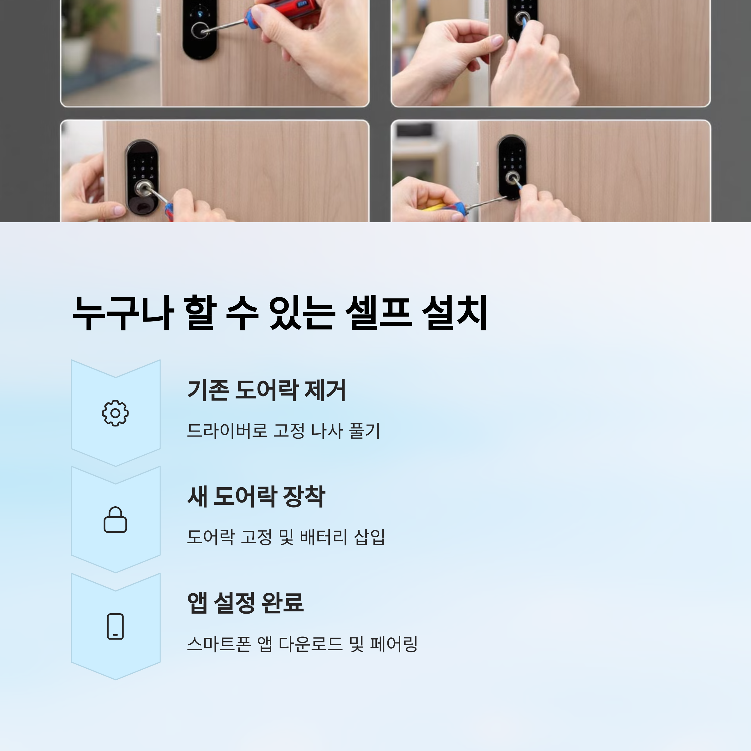 요즘 나오는 스마트 도어락은 대부분 초보자도 쉽게 설치할 수 있도록 구성돼 있어요. 기본 공구만 있으면 셀프 설치도 얼마든지 가능하답니다. 아래 순서를 참고해서 도전해보세요!