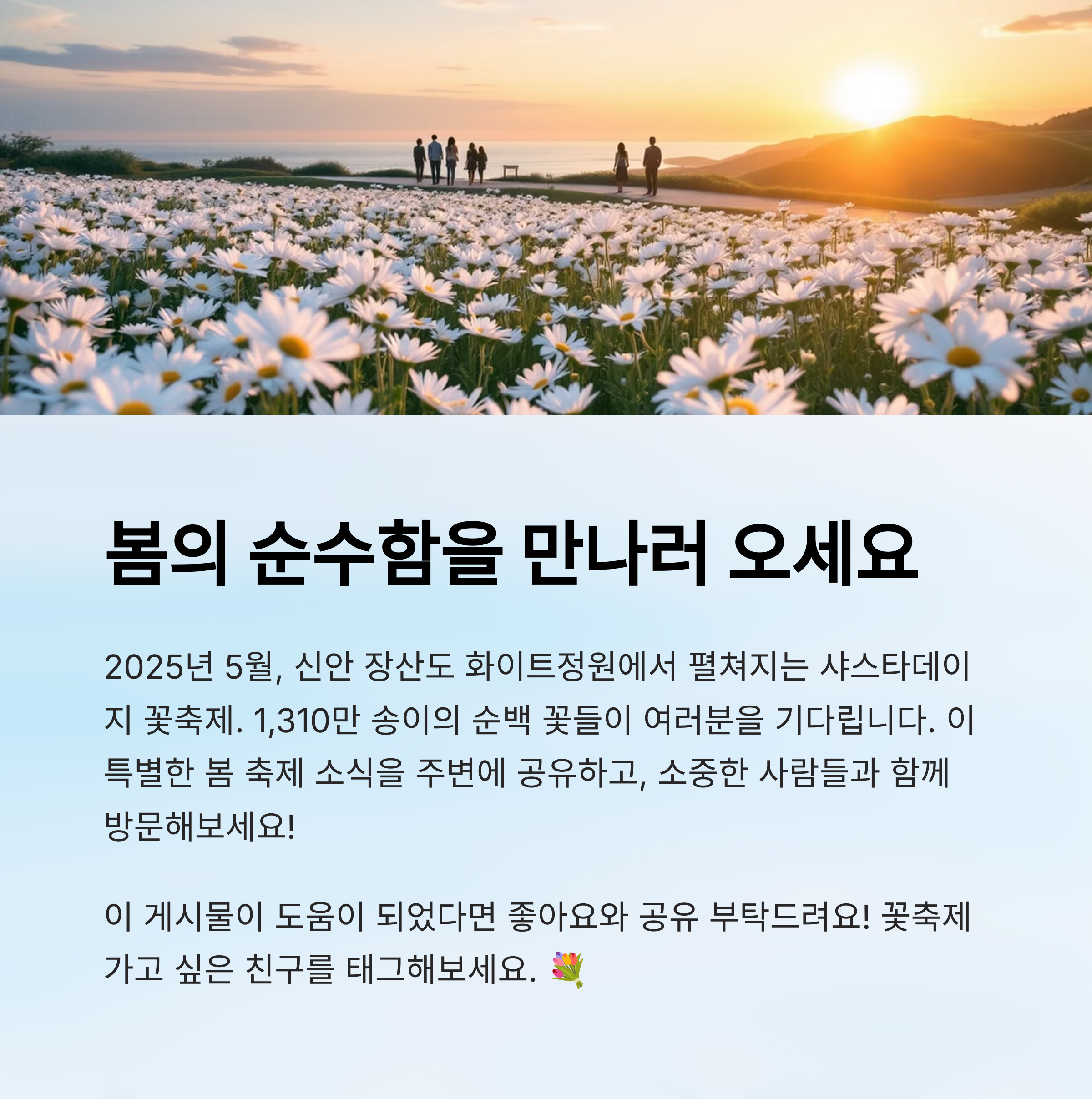 내가 생각했을 때 이 축제는 단순히 사진 찍으러 가는 곳이라기보단, 일상에 지친 마음을 자연으로 씻어내는 그런 힐링 여행 같은 느낌이에요. 진짜 바람 소리, 꽃향기, 파도 소리까지 온몸으로 느껴보는 시간이 될 거예요. 🍃