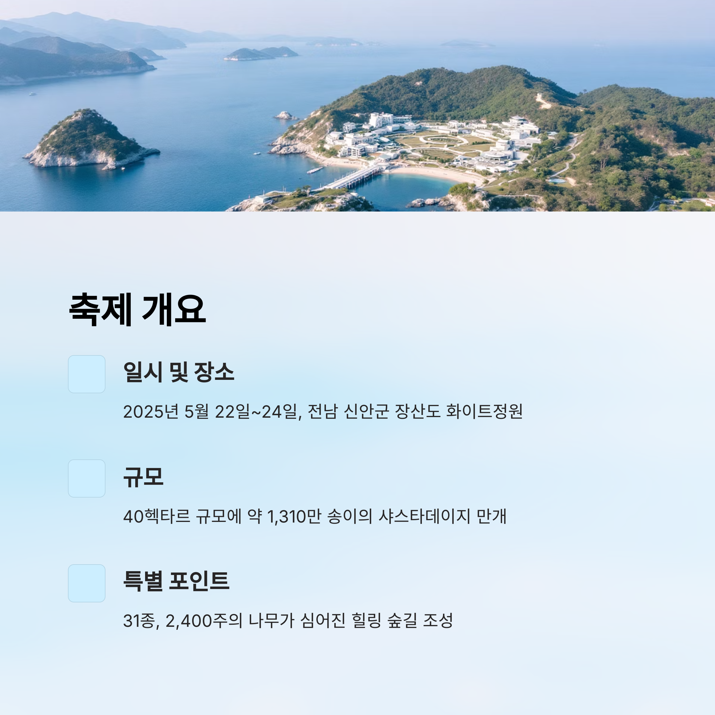 신안군의 기존 꽃 축제들—예를 들어 임자도 튤립축제나 도초 수국축제—역시 사전 예약 없이 운영되어 왔어요. 따라서 이번 샤스타데이지 축제도 대체로 비슷한 방식이 적용될 것으로 보여요. 즉, 축제가 열리는 3일간 장산도 화이트정원으로 직접 가면 누구나 즐길 수 있다는 뜻이죠!
