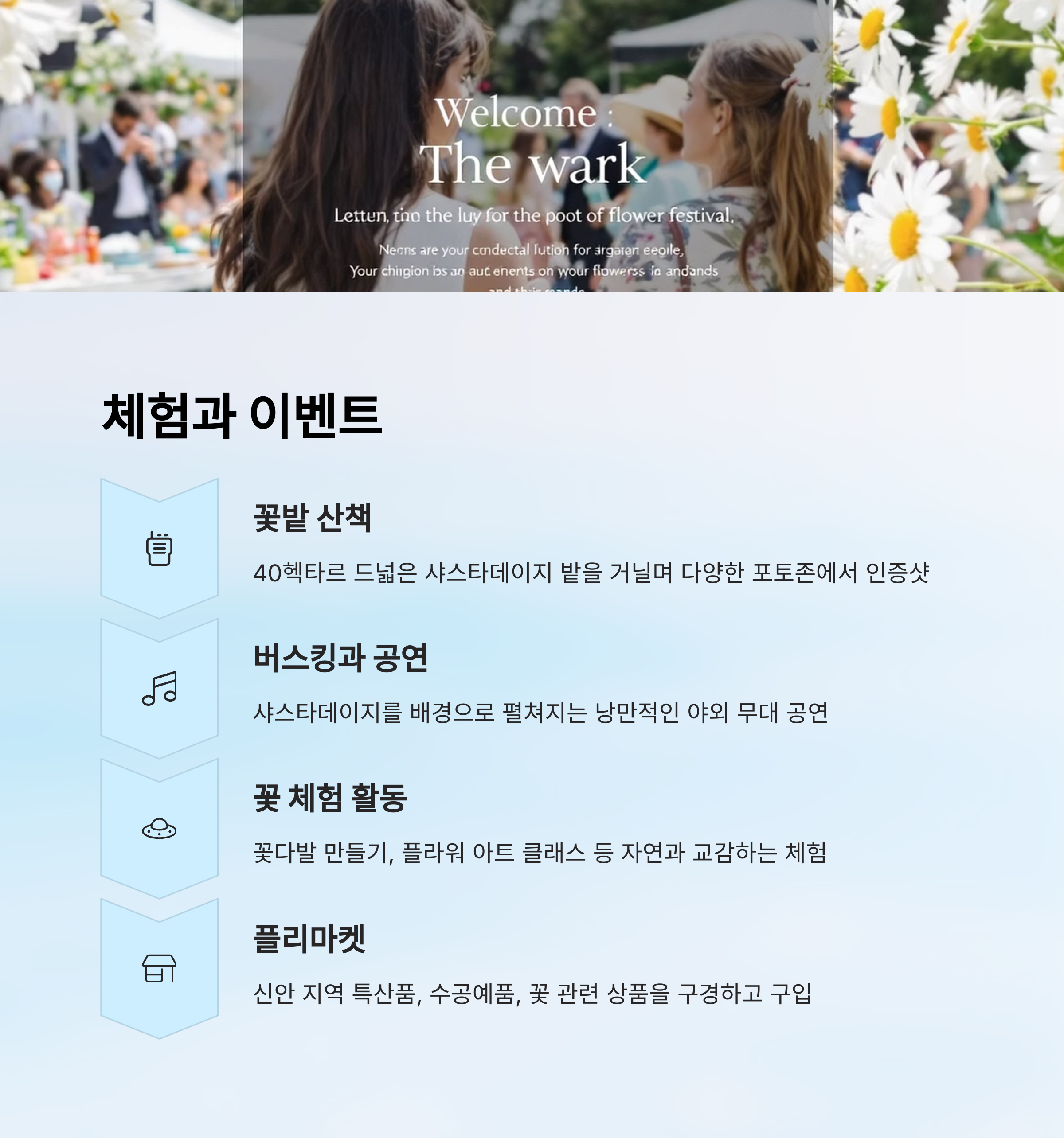 축제하면 빠질 수 없는 게 바로 체험과 이벤트예요! ‘2025 섬 샤스타데이지 꽃 축제’도 예외는 아니에요. 공식적으로 세부 일정이 모두 공개되진 않았지만, 그동안 다른 지역 꽃 축제 사례를 보면, 이번 축제에서도 다채로운 즐길 거리가 가득할 가능성이 높아요. 😄