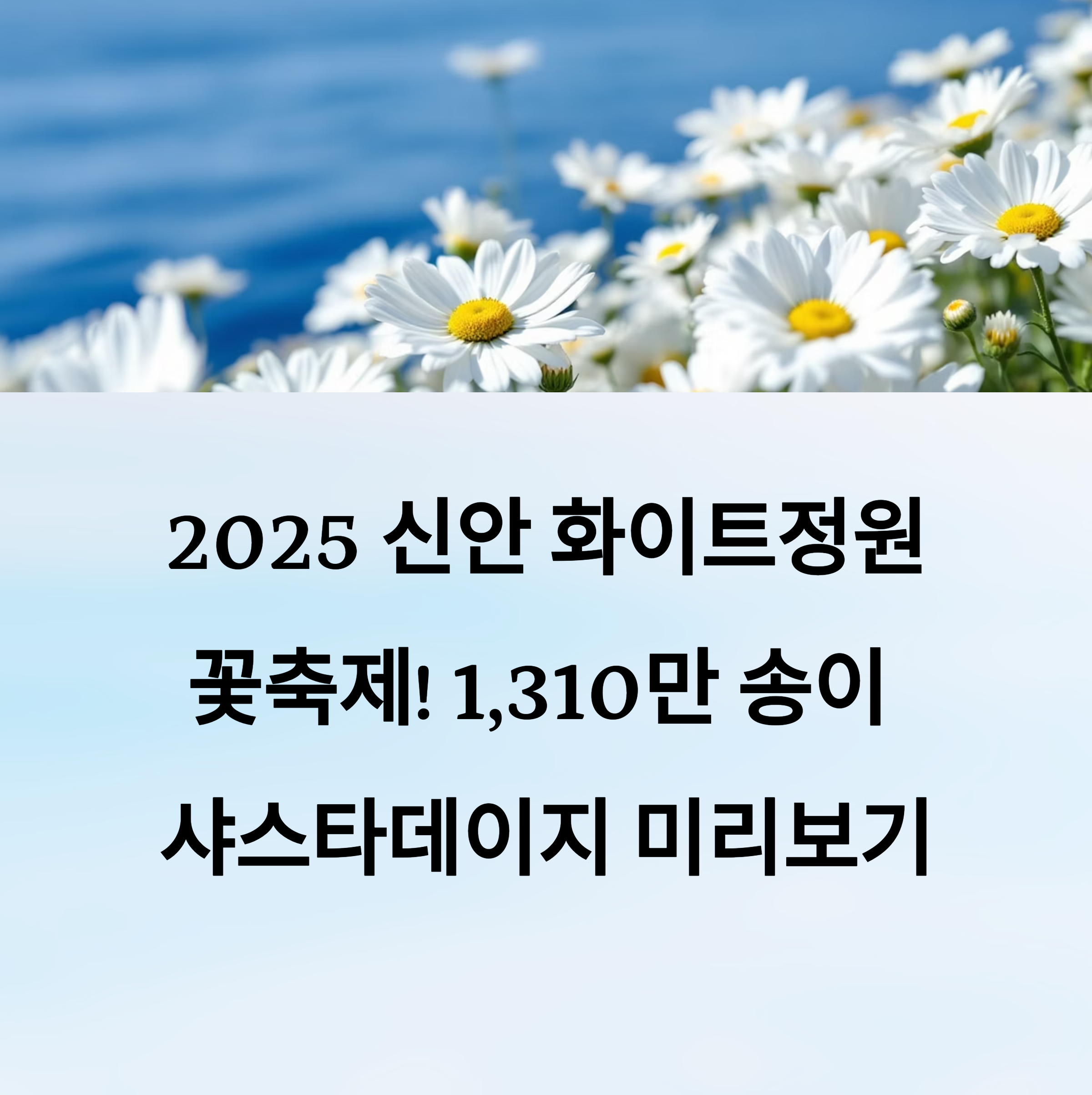 샤스타데이지는 순백의 매력을 가진 꽃으로, 장산도의 아름다운 풍경과 어우러져 한 폭의 그림 같은 장관을 만들어내요. 이번 '2025 섬 샤스타데이지 꽃 축제'는 그 첫 걸음을 내딛는 특별한 행사로, 40헥타르 규모의 화이트정원에서 약 1,310만 송이의 샤스타데이지가 만개해요. 🌼