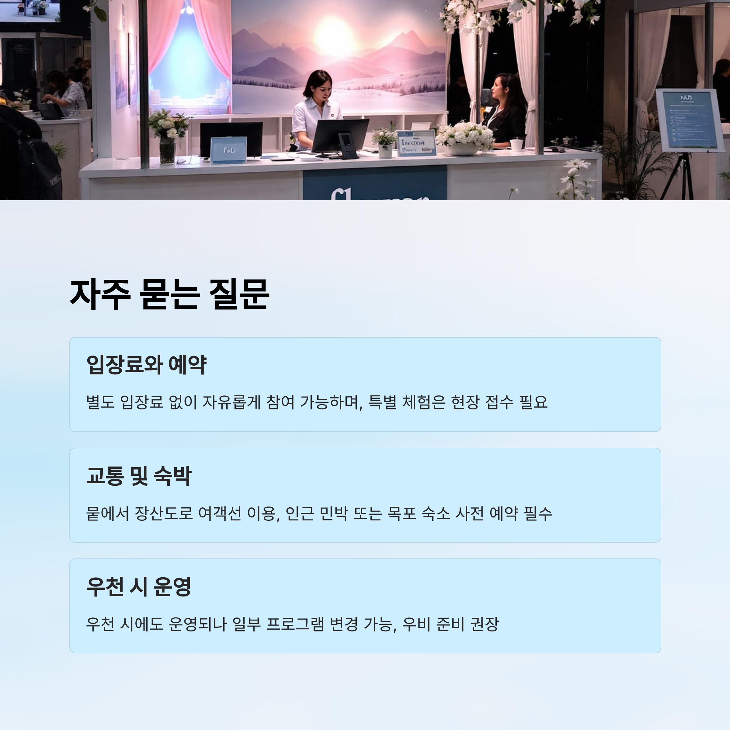 다만, 일부 **특별 체험 프로그램이나 공연 좌석**이 필요한 경우, 현장 접수나 사전 신청이 필요한 경우도 생길 수 있어요. 예를 들어 꽃다발 만들기 체험, 지역 가이드 투어, 워크숍 등은 참가 인원이 제한되기 때문에 별도 신청이 필요할 수 있어요. ✍️