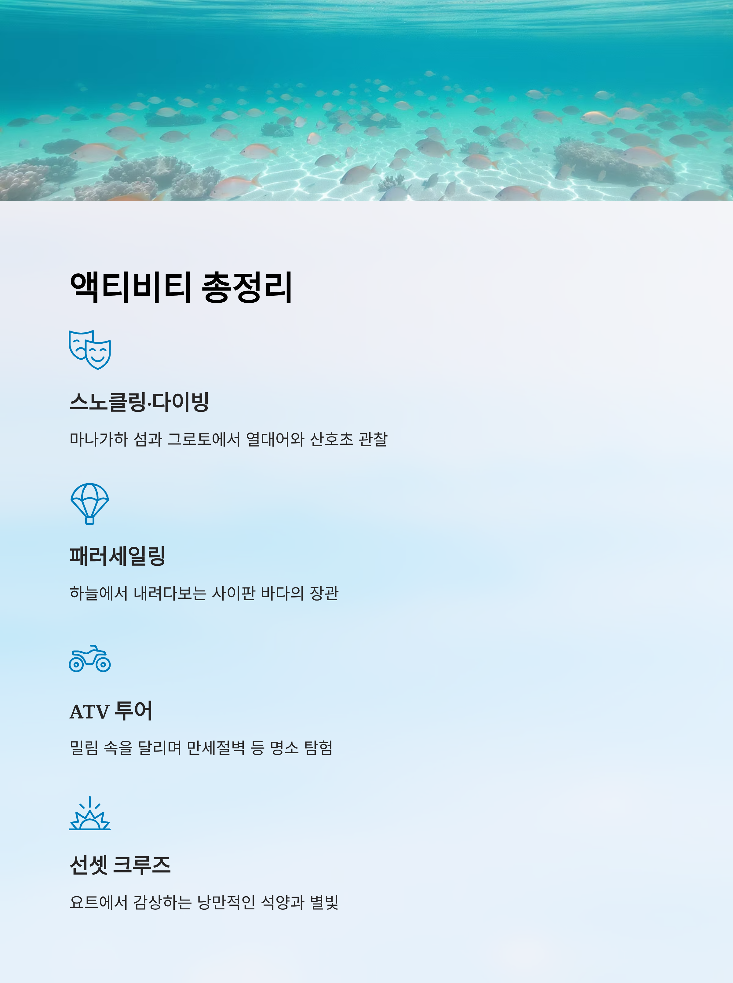 사이판은 작지만 다양한 액티비티를 즐길 수 있는 곳이에요. 단순히 해변에서 수영만 하는 게 아니라, 바다 위에서 스릴 넘치는 스포츠부터 육지에서의 탐험까지 알찬 경험을 할 수 있어요. 여행 스타일에 따라 액티비티를 고르면 여행 만족도가 두 배가 된답니다. 🏖️