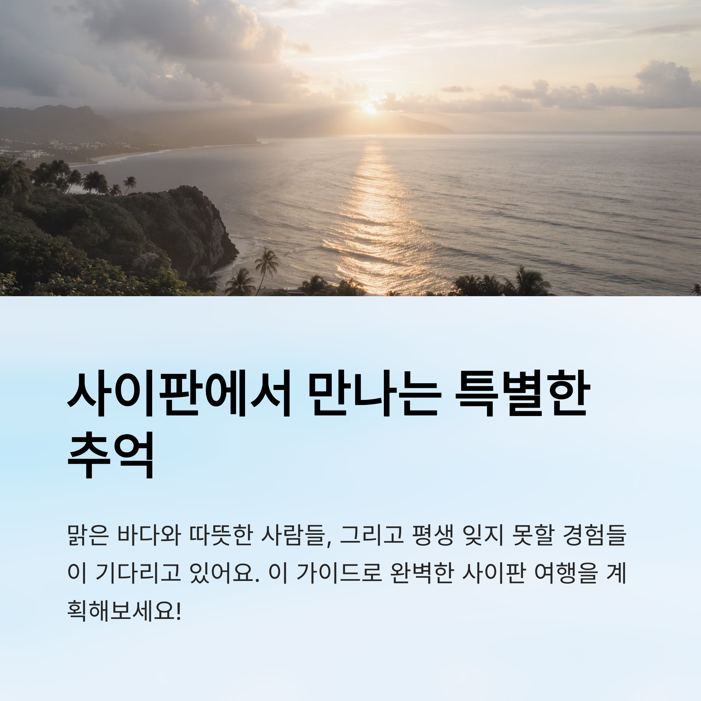 이번 글에서는 항공권부터 숙소, 액티비티, 예산 플랜까지 사이판 여행에 필요한 모든 걸 싹 정리해 드릴게요. 제가 직접 느낀 점도 곁들여서 알려드리니, 여행 준비하는 분들께 큰 도움이 될 거라고 생각해요. 특히 "가성비"를 따지는 분들과 "가심비"를 챙기는 분 모두 만족할 수 있도록 비교 분석을 준비했답니다. 🍹