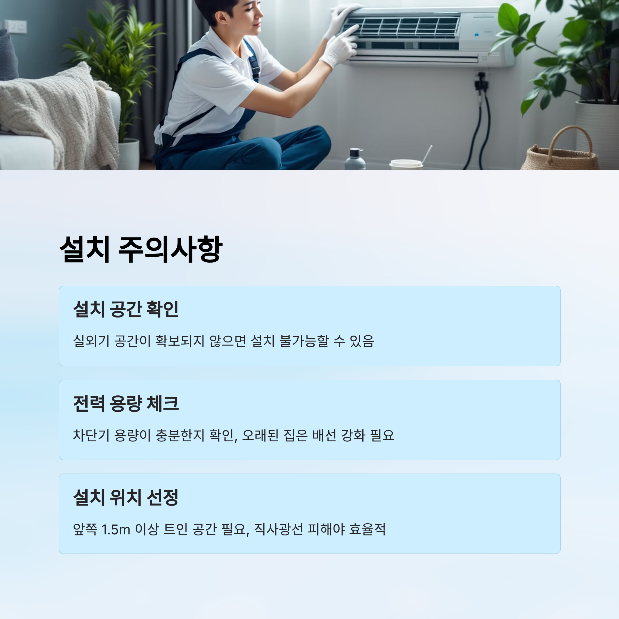 에어컨을 고르기만 잘하면 끝일까요? 사실 진짜 중요한 건 설치 과정이에요. 아무리 좋은 에어컨이라도 설치가 엉망이면 성능이 반도 안 나올 수 있거든요. 이 섹션에서는 설치할 때 꼭 챙겨야 할 팁과 구매 전 반드시 체크해야 할 사항들을 정리해드릴게요! 🧐