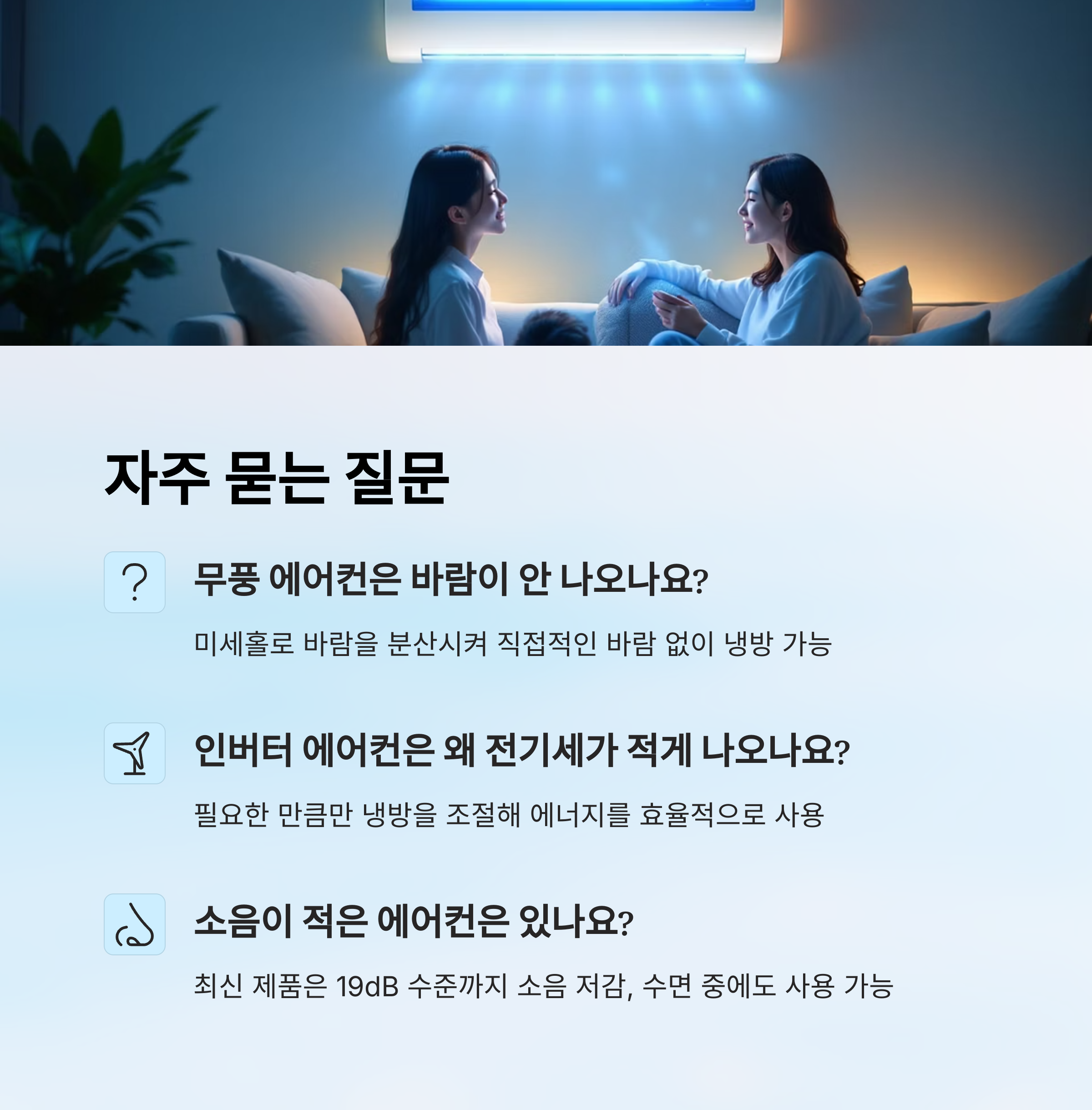 A2. 무풍 에어컨은 일반 바람구멍 대신 미세한 수천 개의 미세홀로 바람을 분산시켜 피부에 바람이 직접 닿지 않게 해줘요. 실제로 바람은 나오지만 부드럽게 느껴져요.