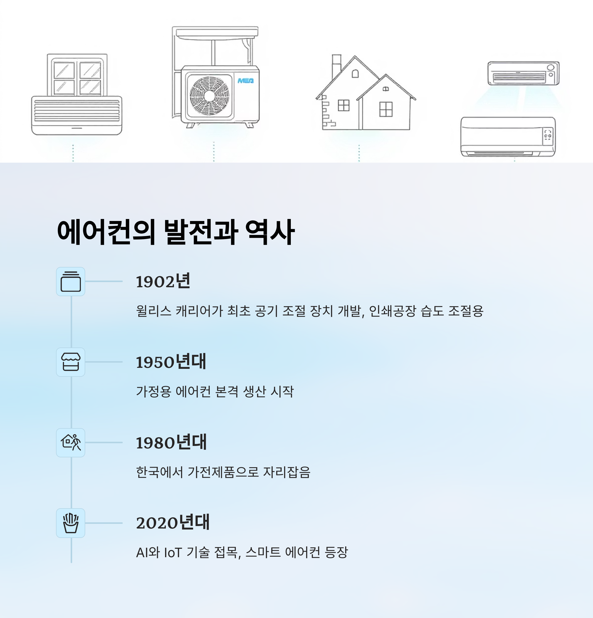 | 1950년대 | 가정용 에어컨 등장 | 단순 냉방 기능 중심 |