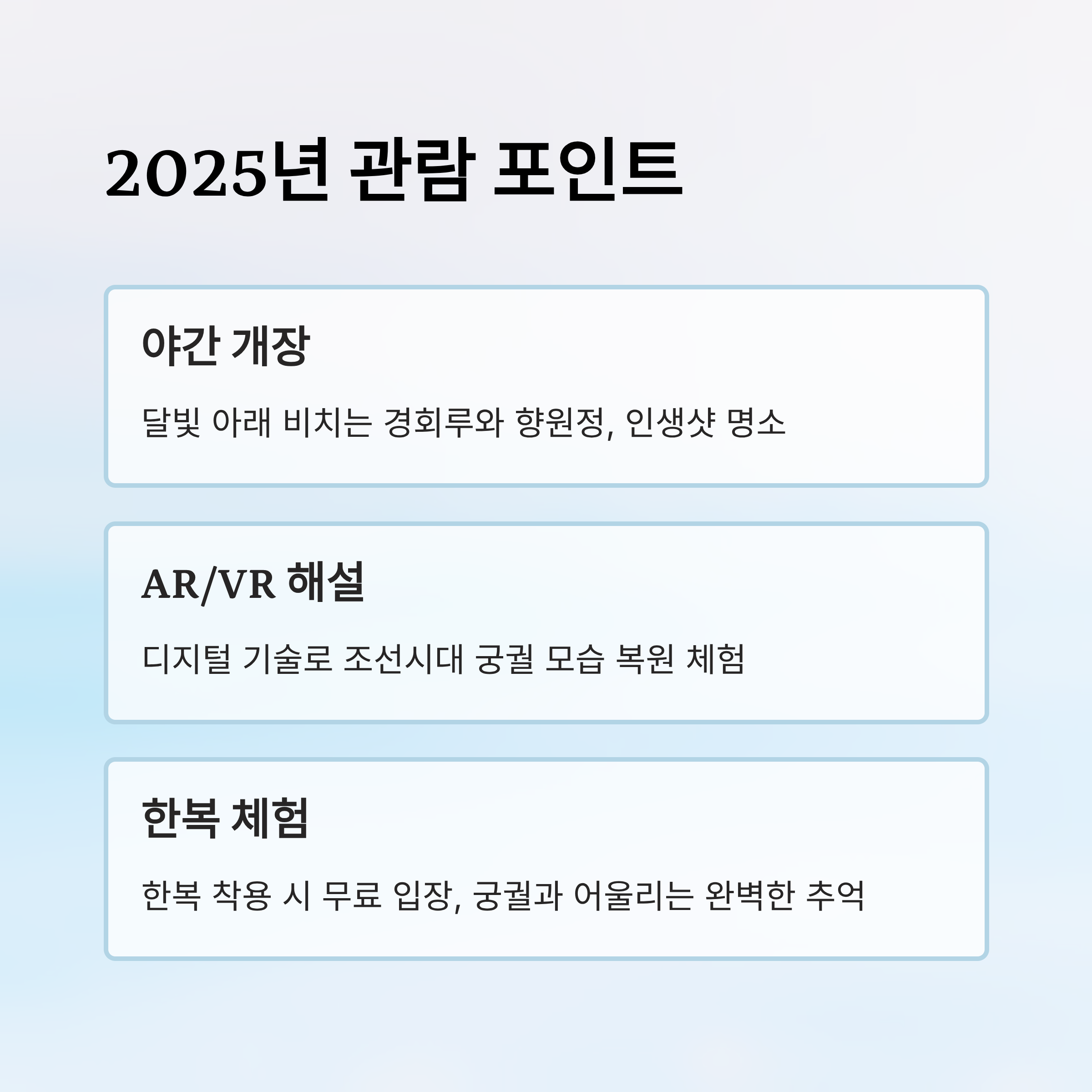 특히 2025년에는 다양한 문화 프로그램과 야간개장이 확대되면서 더 풍성한 즐길 거리가 마련되었어요. 전통과 현대가 공존하는 공간으로, 한복을 입고 방문하면 무료입장이 가능해 많은 사람들이 특별한 추억을 만들고 있어요.