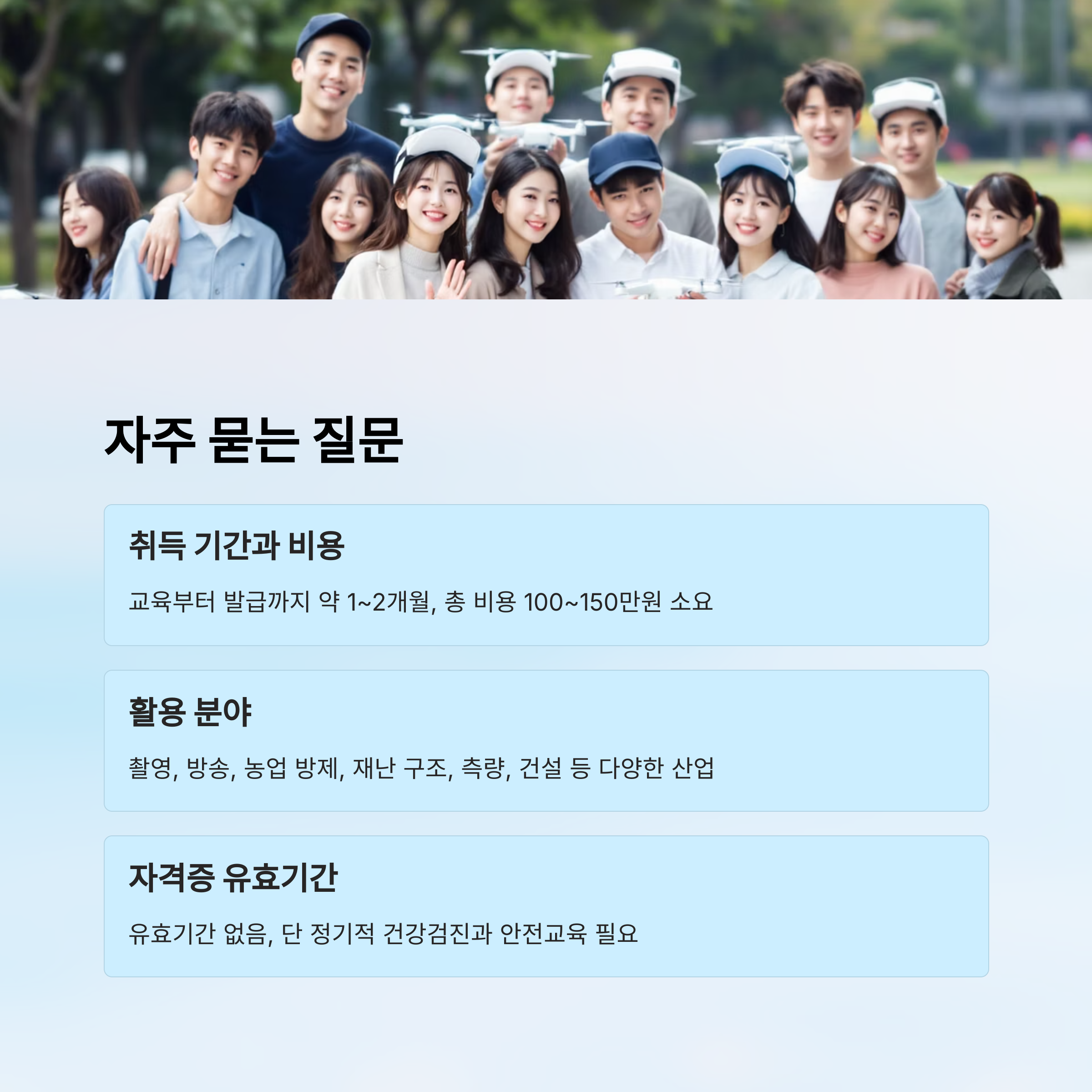 A5. 촬영, 방송, 농업 방제, 재난 구조, 측량, 건설 등 다양한 산업 분야에서 활용 가능해요. 자격증은 실제 취업에도 큰 도움이 돼요.