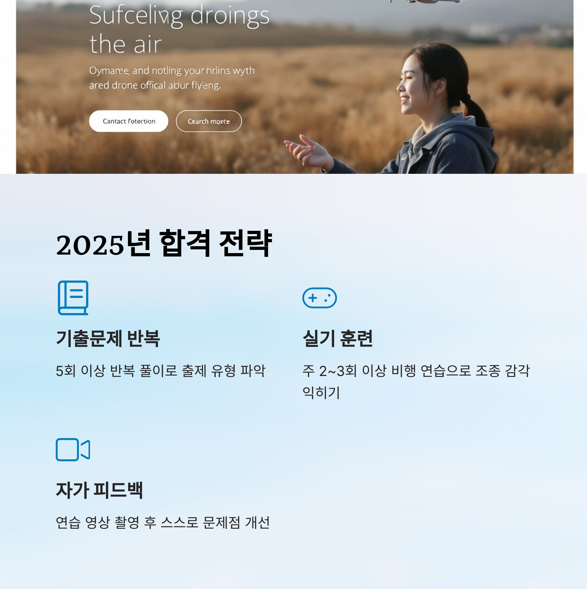 | 실기 훈련 | 매주 2~3회 이상 비행 연습 | 시뮬레이터 앱, 연습용 드론 |