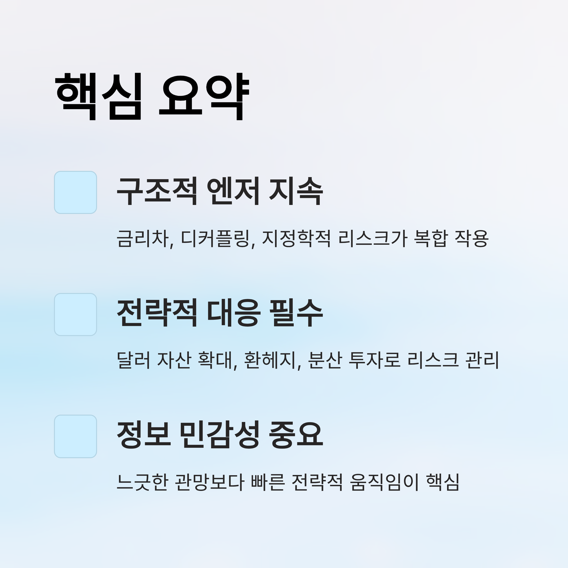 결국 핵심은 정보에 대한 민감성과 빠른 대응이에요. 2025년 환율 시장에서는 '느긋한 관망'보다는 '전략적 움직임'이 훨씬 중요한 시점이 될 거예요.📈