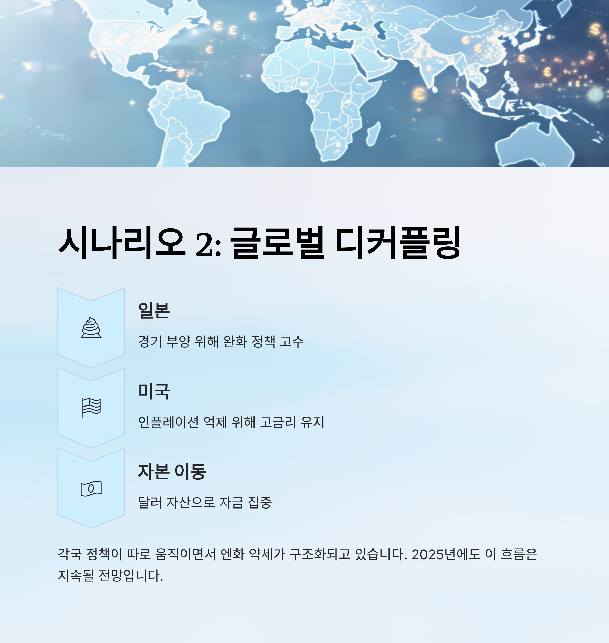 글로벌 디커플링은 각국의 경제 정책과 흐름이 서로 따로 움직이는 현상을 말해요. 예전에는 미국이 금리를 올리면 일본도 어느 정도 따라갔지만, 요즘은 전혀 달라요. 일본은 경기 부양을 위해 완화 정책을 고수하고 있고, 미국과 유럽은 인플레이션 억제를 위해 고금리를 유지하고 있죠.