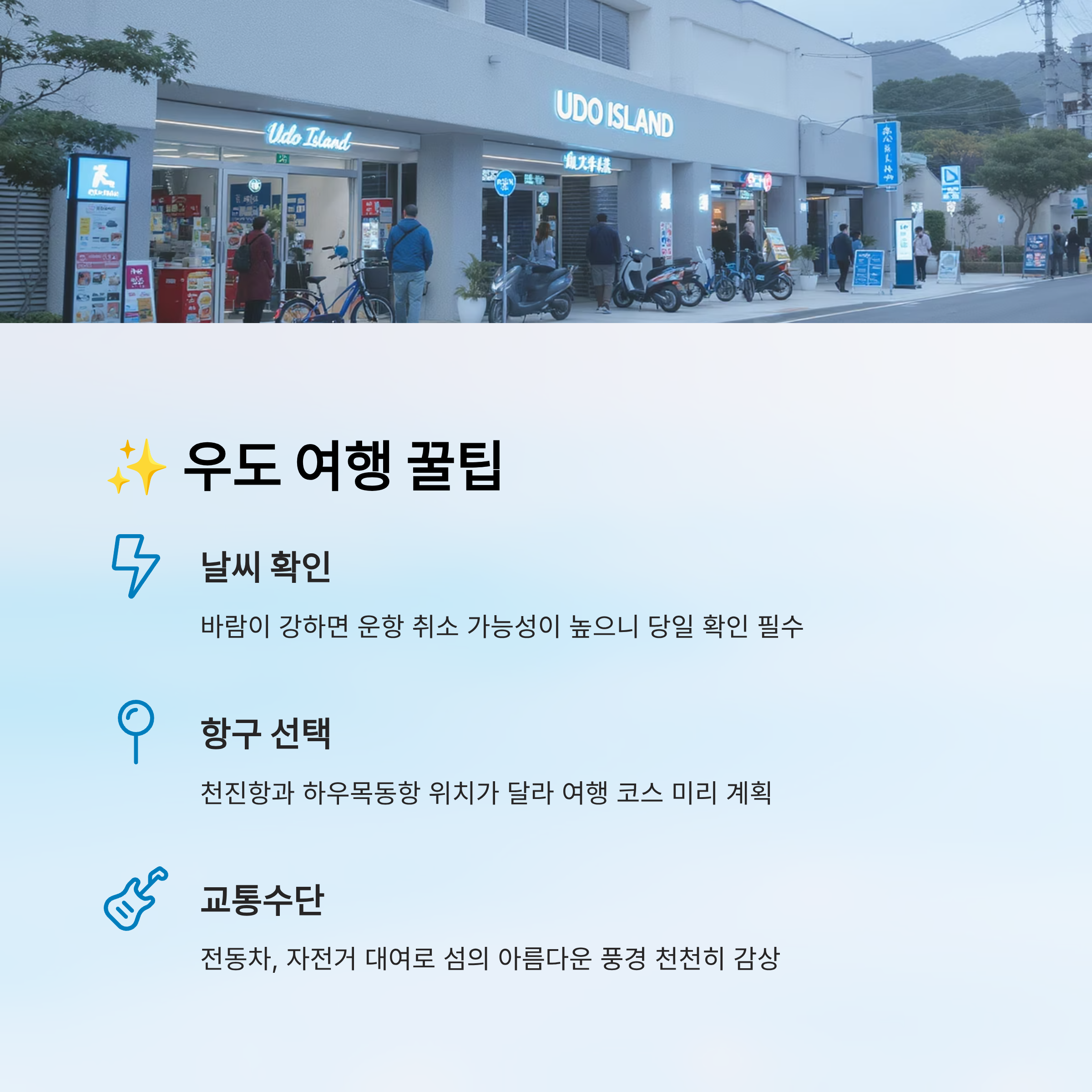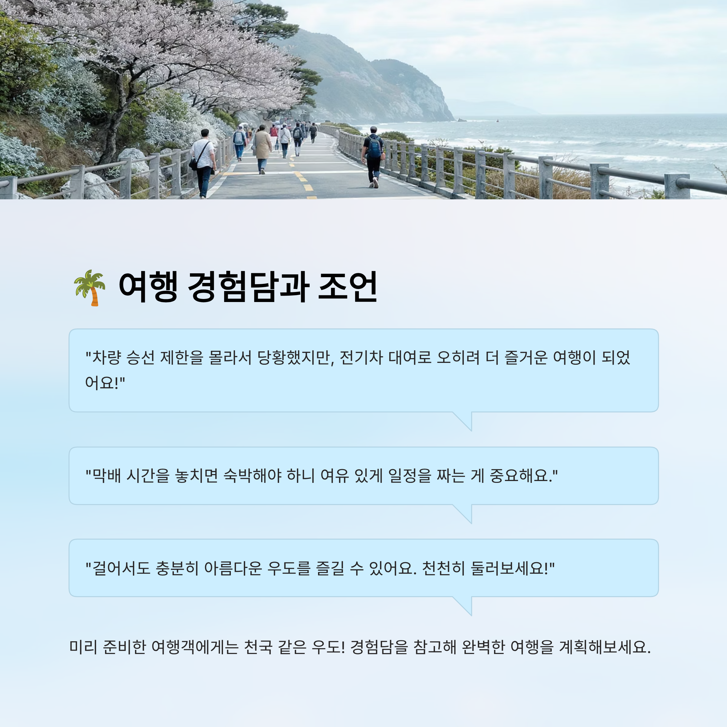 현지인들은 차량 없이 우도 여행을 권장하는 경우가 많아요. 섬이 크지 않고, 걸어서도 주요 명소를 충분히 둘러볼 수 있기 때문이에요. 특히 여름철에는 전동 스쿠터나 전기자전거를 빌려 해안도로를 달리는 게 여행의 하이라이트라는 이야기를 많이 들었어요. 🏝️