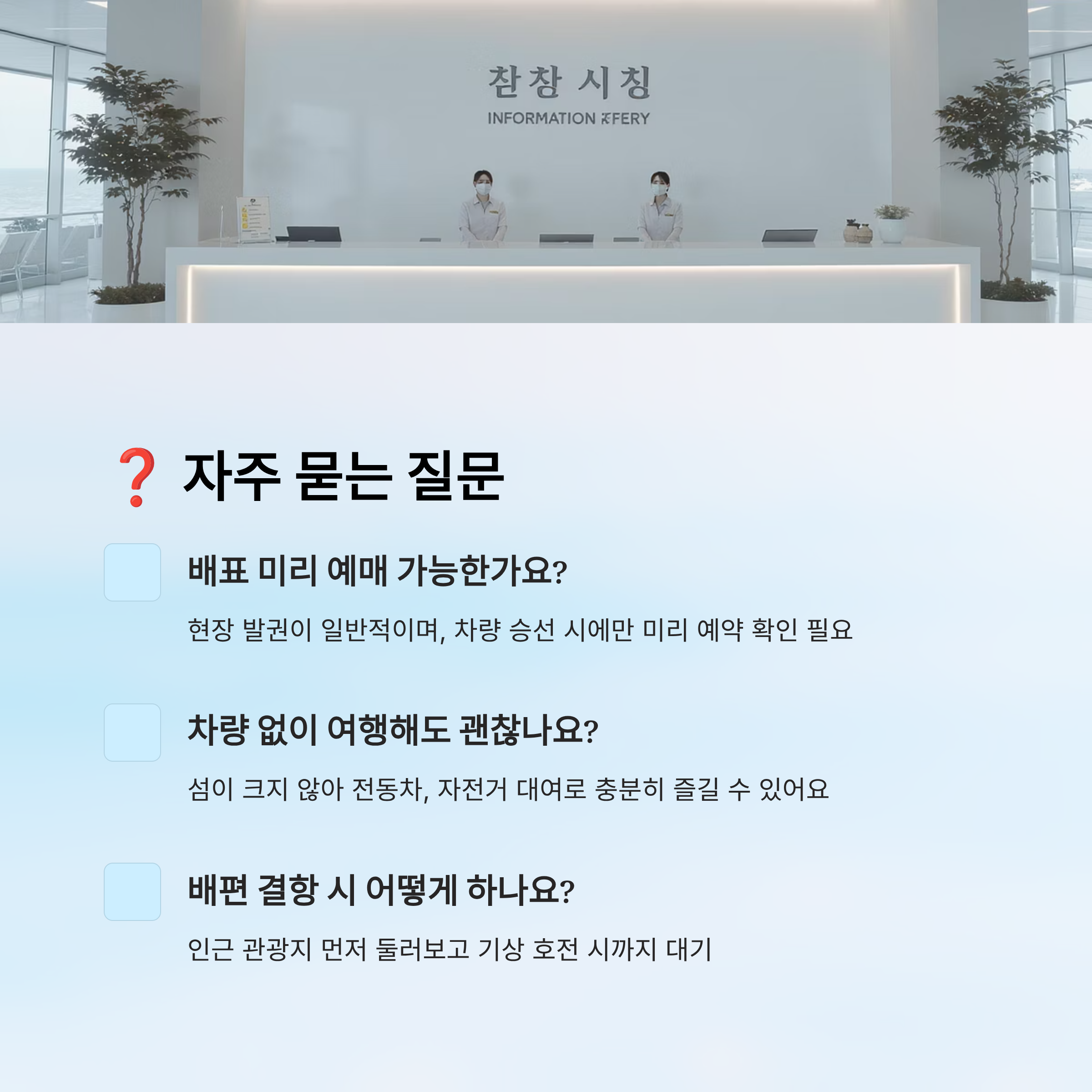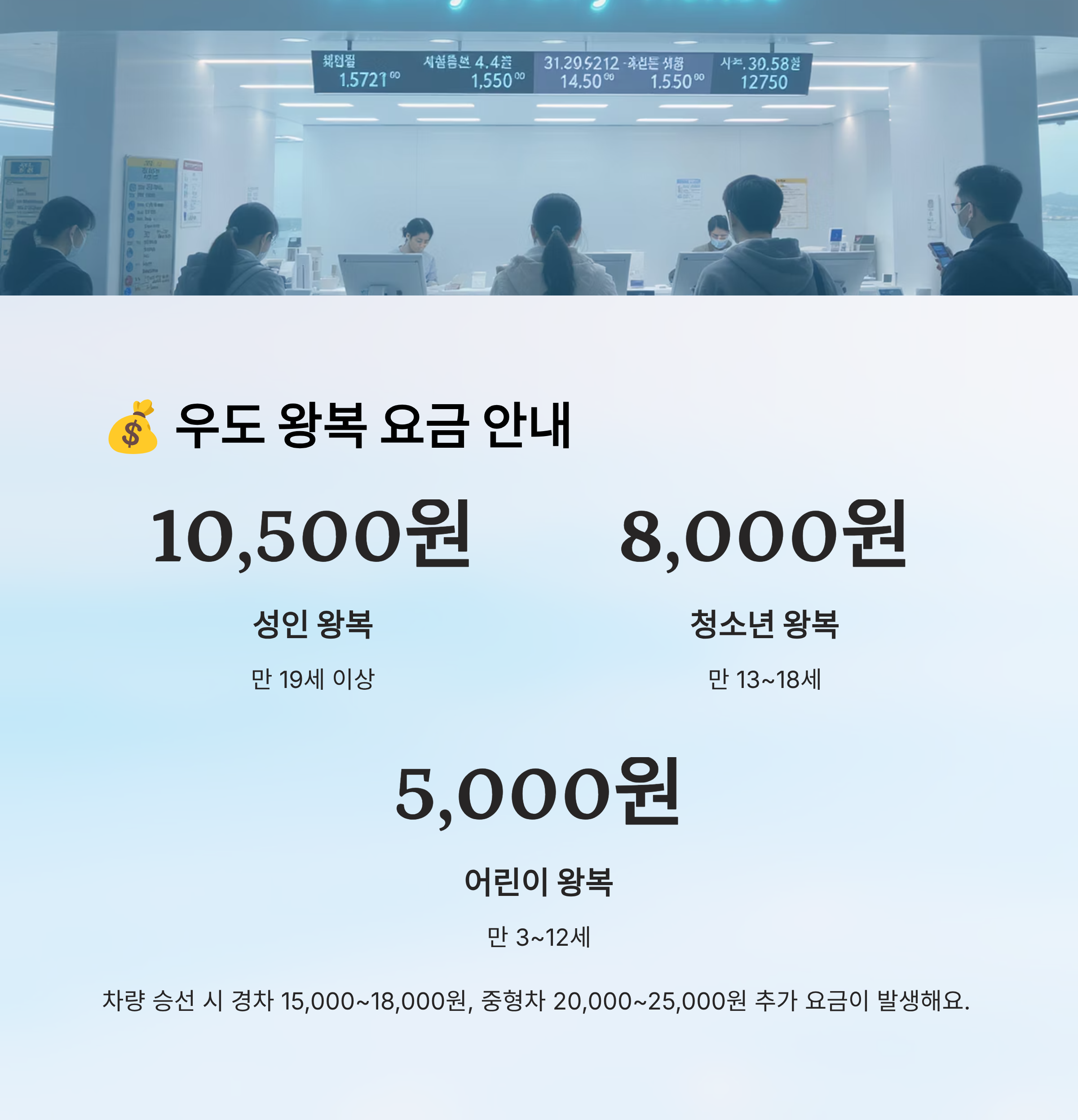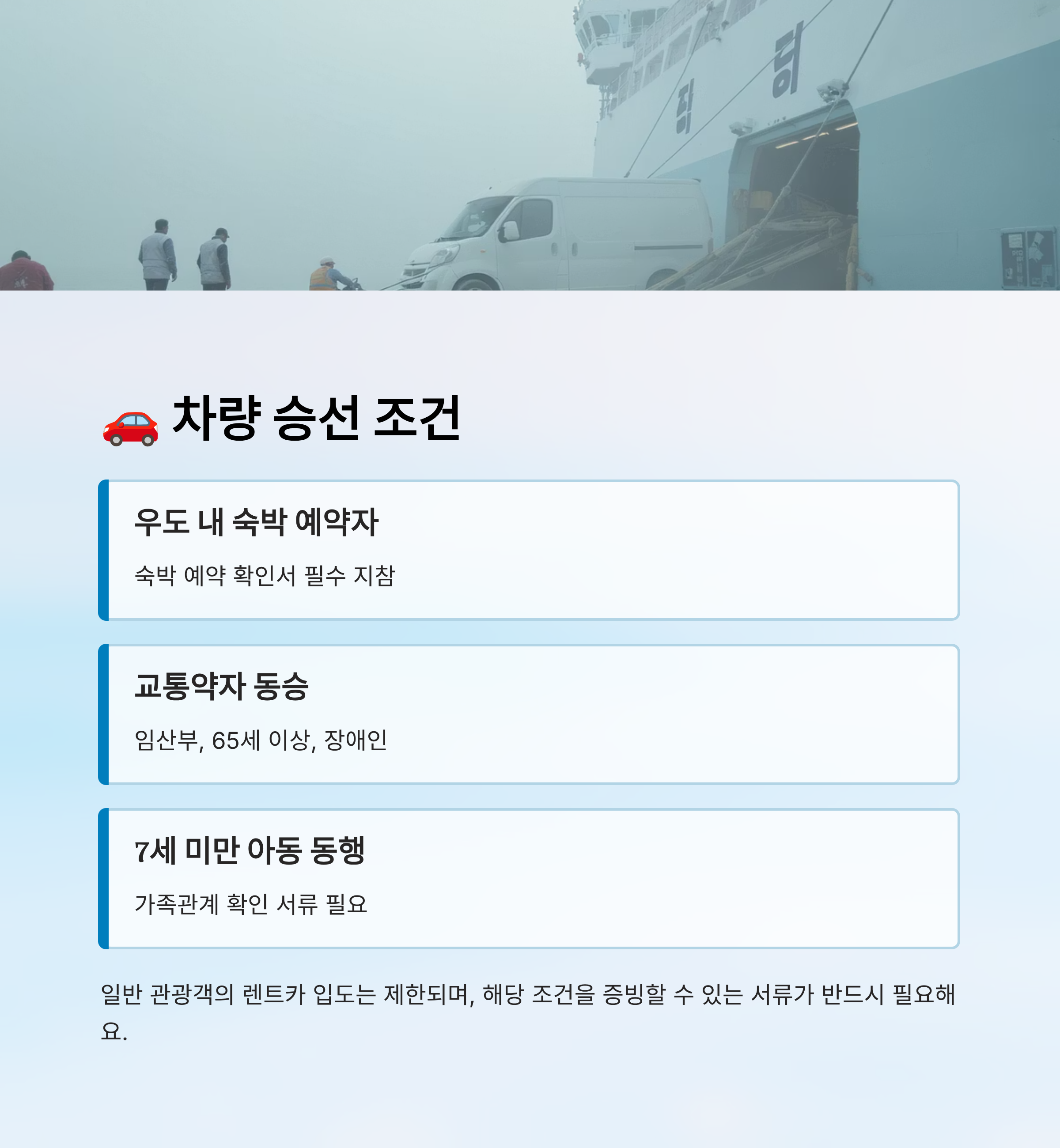 차량을 함께 싣고 들어가야 한다면 차량 크기에 따라 별도 요금이 추가돼요. 경차와 승용차는 상대적으로 저렴하고, SUV나 대형 승합차는 요금이 더 비싸요. 게다가 차량 동반 승선은 조건이 제한돼 있어서 숙박 예약 확인서 같은 서류가 필요하다는 점도 잊으면 안 돼요.