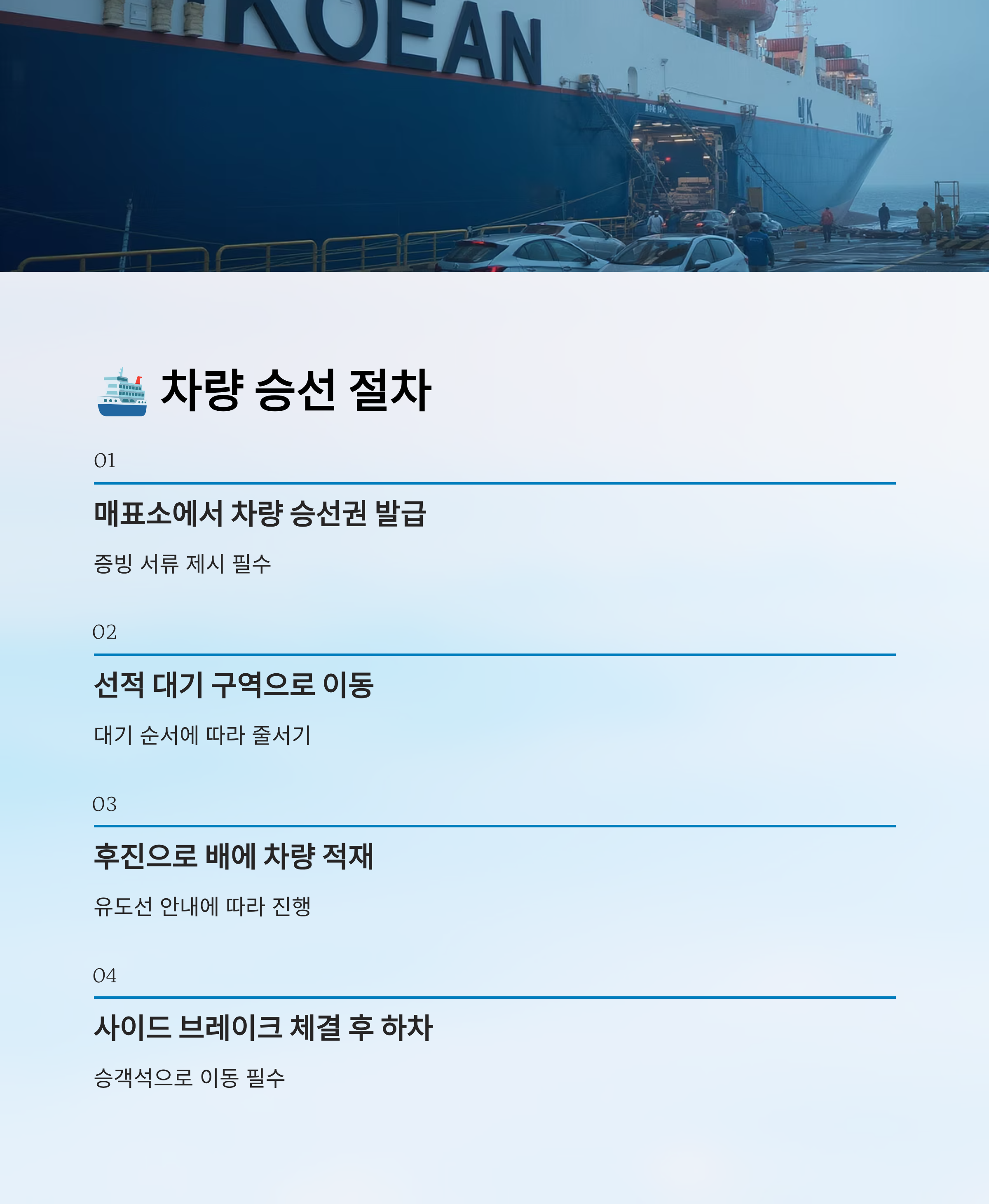 차량 승선 절차를 미리 알고 있으면 현장에서 훨씬 여유로워요. 특히 후진 주차에 자신 없는 운전자라면 선적 요원에게 적극적으로 도움을 요청하는 게 좋아요. 요원들도 관광객 안전을 위해 친절하게 안내해 주니 걱정하지 않아도 돼요. ⛴️