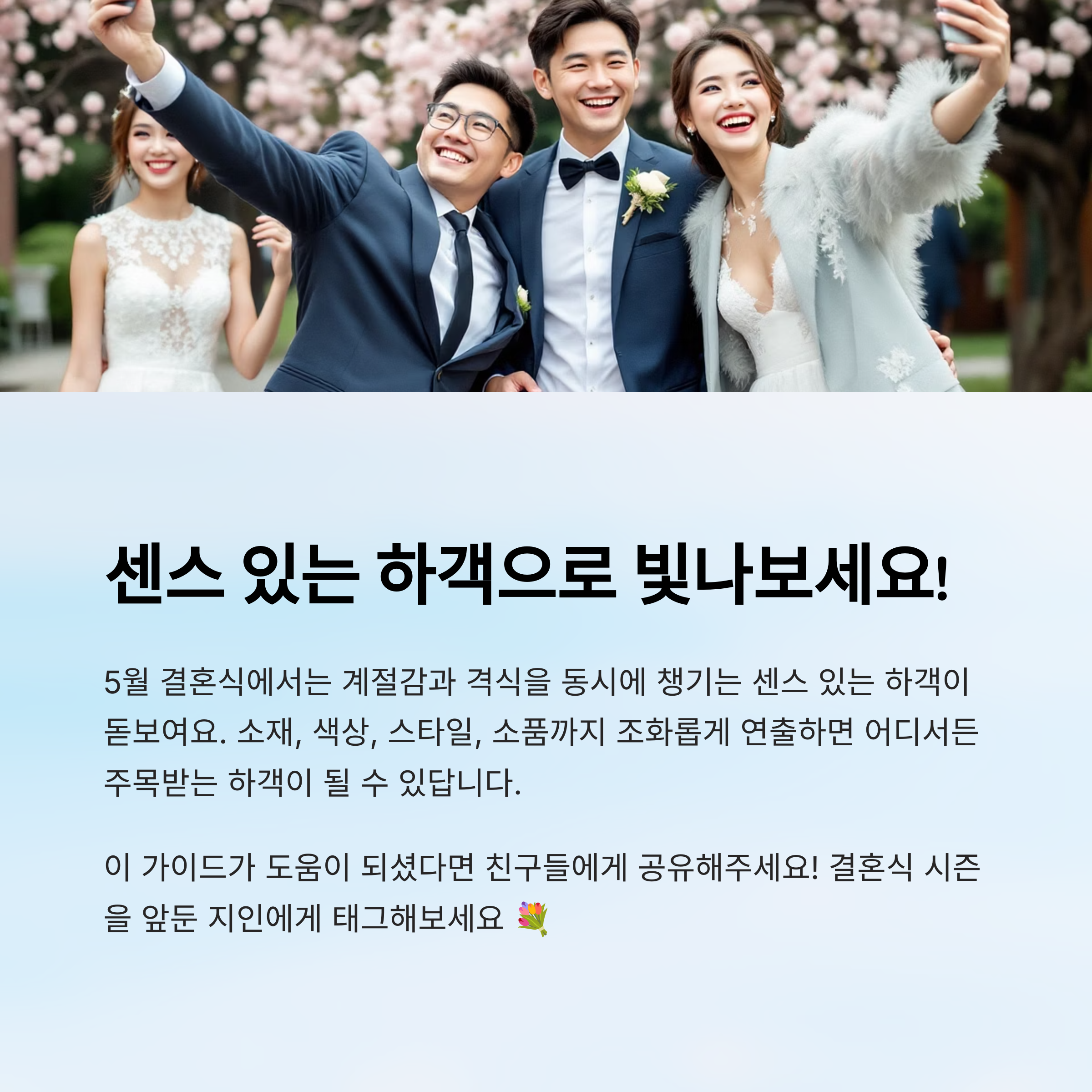 5월 결혼식에는 계절감과 격식을 동시에 챙기는 센스 있는 하객이 돋보여요. 소재, 색상, 스타일, 소품까지 조화롭게 연출하면 어디서든 주목받는 하객이 될 수 있답니다 🌼