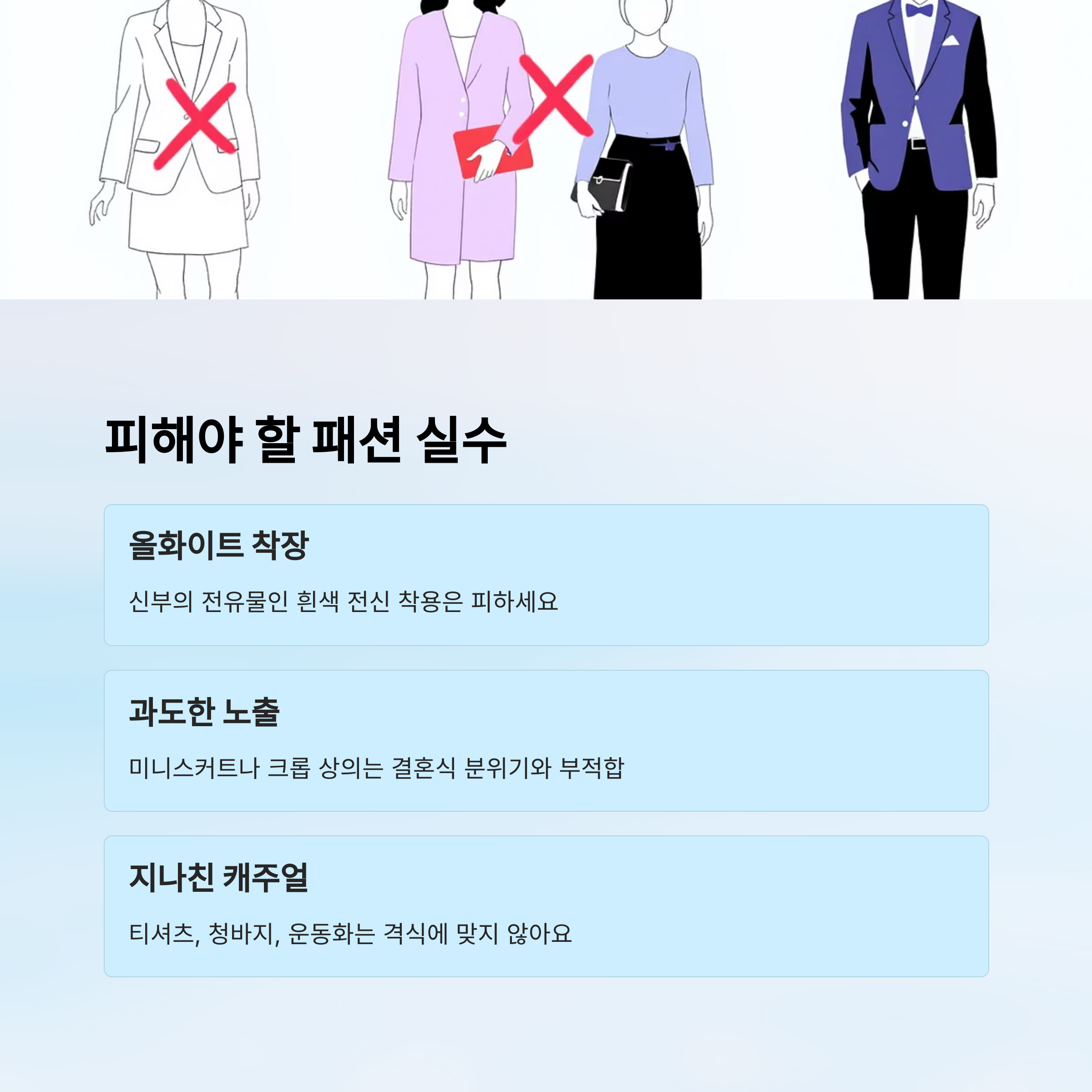 | 지나친 노출 | 예식 분위기 해침 | 오프숄더 + 숄 또는 가디건 |