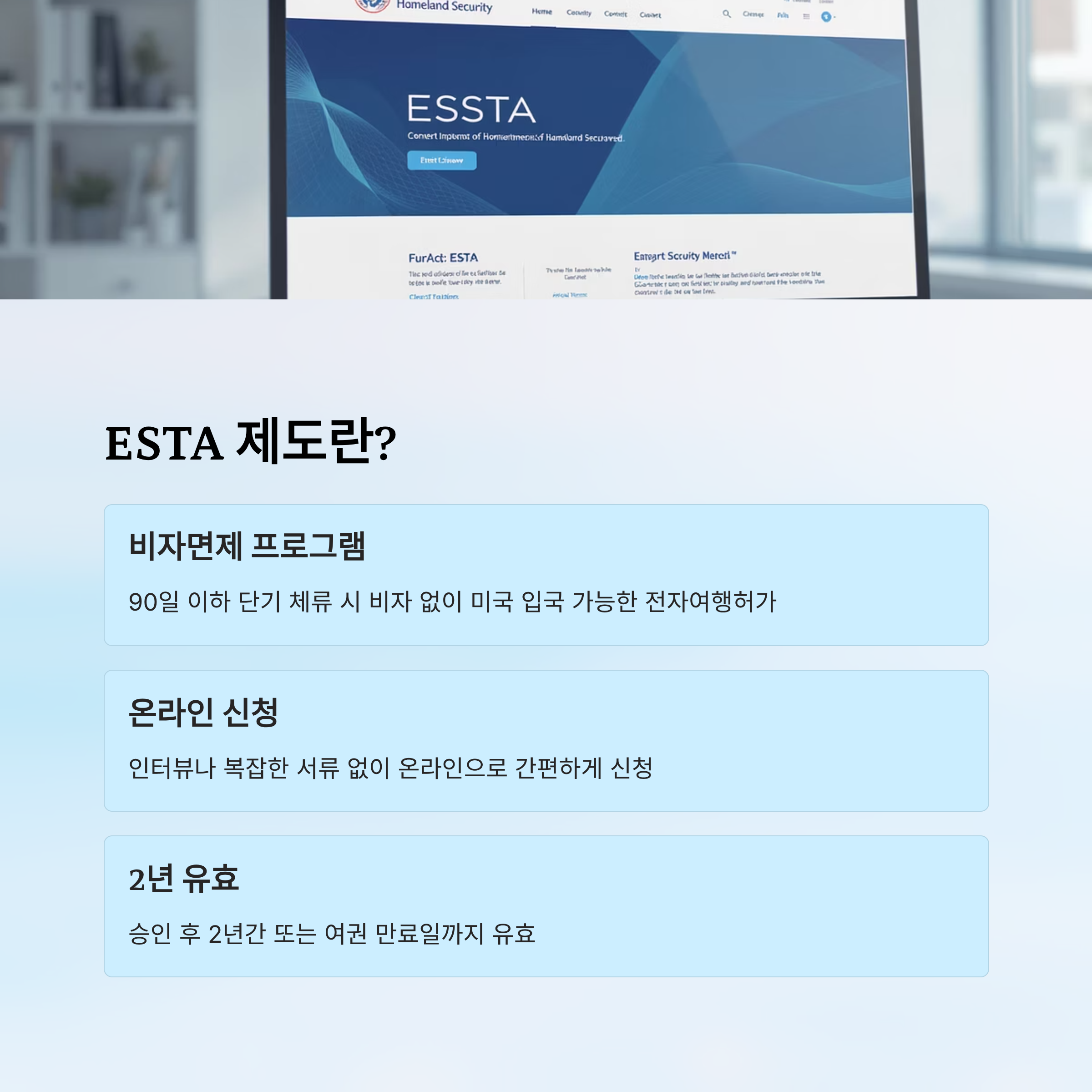 ESTA는 미국 비자면제 프로그램(VWP: Visa Waiver Program)에 따라 미국을 단기 방문할 수 있도록 사전에 허가받는 제도예요. 미국 국토안보부(DHS)에서 관리하며, 관광, 출장 등으로 90일 이하 체류 시에만 가능해요. 비자와 달리 인터뷰나 복잡한 서류 없이 온라인 신청만으로 진행돼서 많은 사람들이 이용하고 있답니다.
