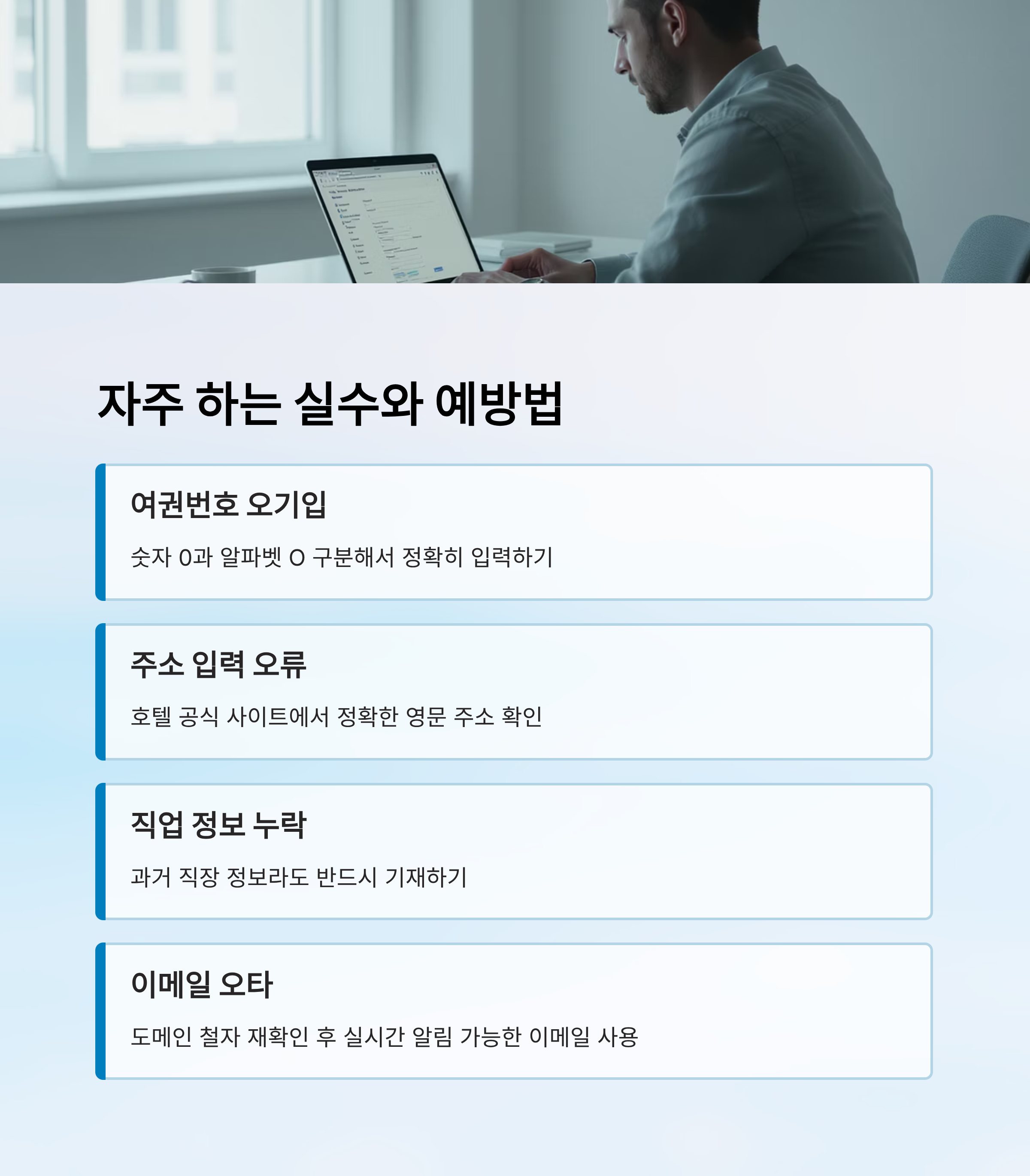 | 여권번호 오기입 | 숫자와 영문 대조 후 입력 |