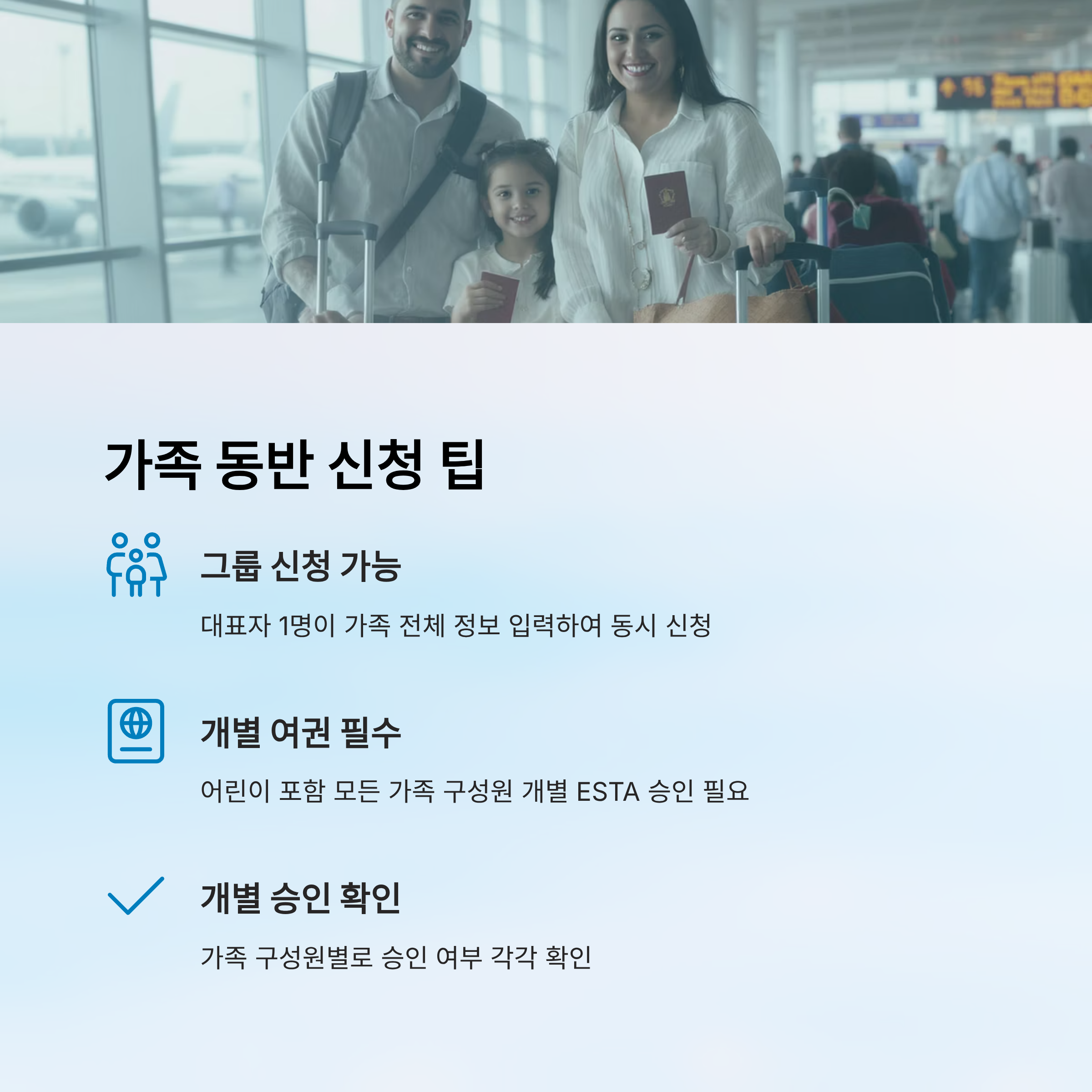 각 가족 구성원 모두 개별 여권이 있어야 하며, 여권 정보, 직업 정보, 미국 체류 주소 등 모든 정보를 정확히 기입해야 해요. 특히 아이가 있는 경우에도 반드시 개별 ESTA 승인을 받아야 해요.