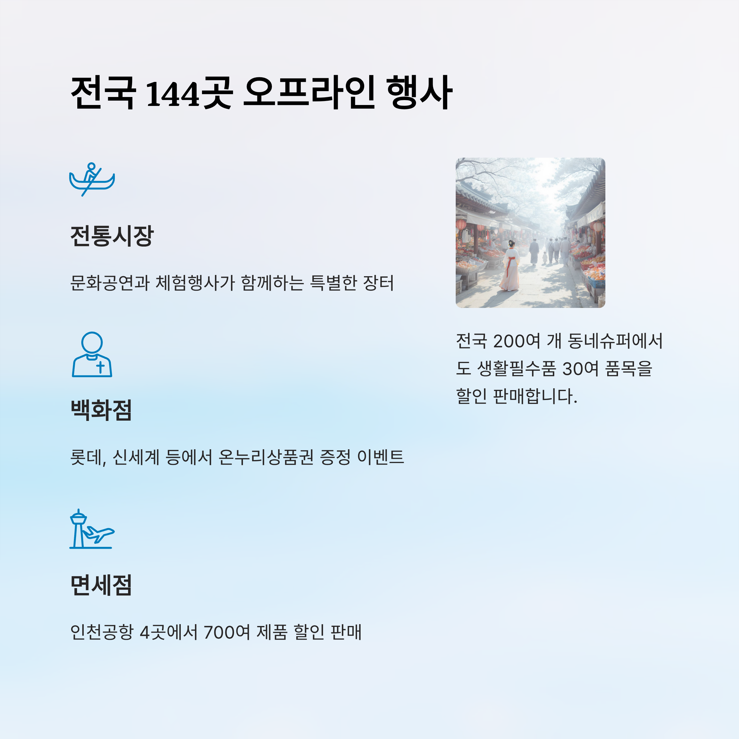 온라인 쇼핑몰에서는 최대 30%까지 할인된 제품을 만나볼 수 있고, 전국 144곳에서는 전통시장과 문화공연이 어우러진 오프라인 행사가 펼쳐져요. 여기에 더해 디지털 온누리상품권 환급과 상생페이백, 경품 이벤트까지 마련되어 소비자에게 실질적인 혜택을 주는 축제로 자리 잡고 있습니다.
