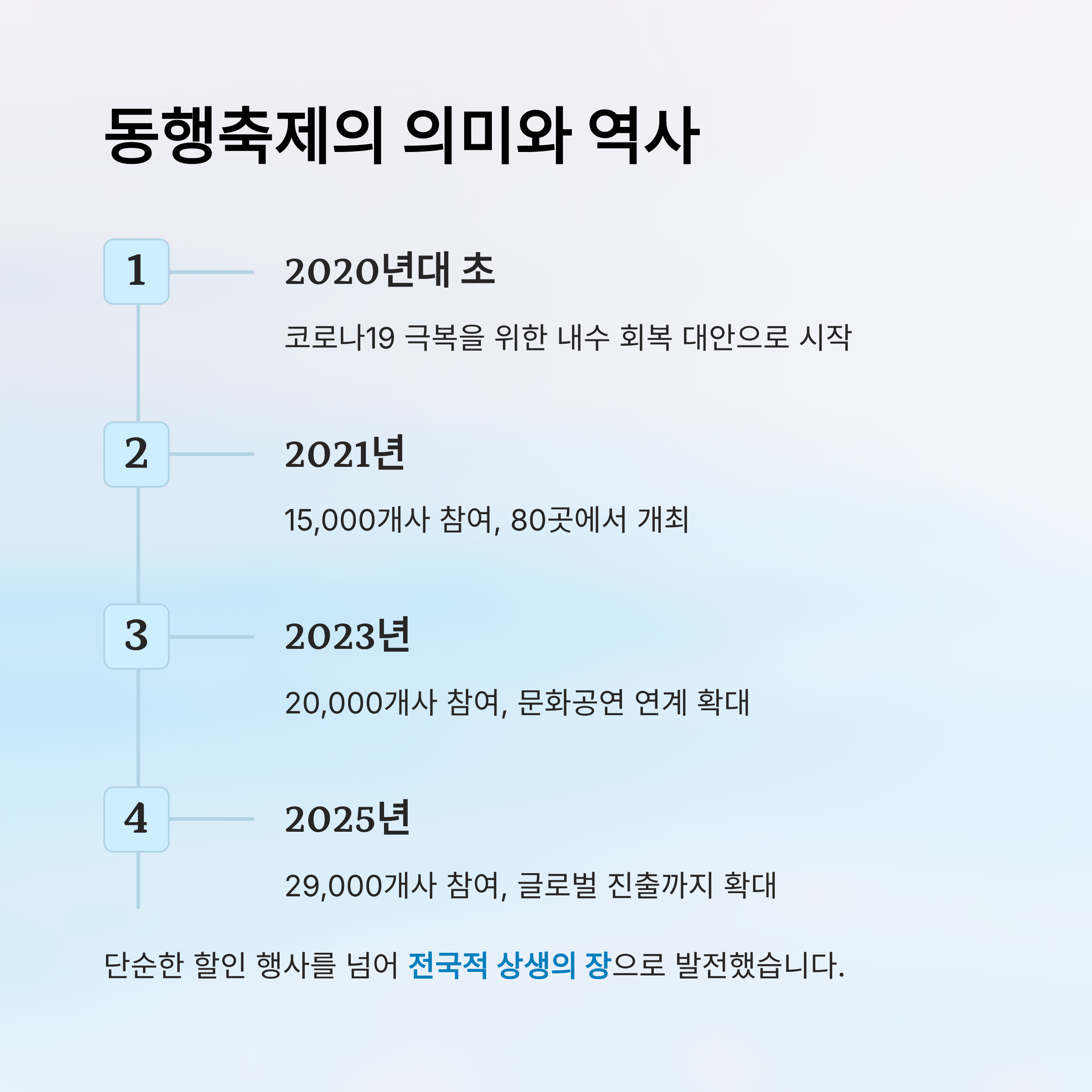동행축제는 소상공인과 소비자가 함께하는 전국적인 소비 촉진 행사로, 2020년대 초반부터 본격적으로 자리 잡기 시작했어요. 코로나19로 침체된 내수를 회복하기 위한 대안으로 시작되었고, 이후 매년 확대되면서 전통시장과 온라인 쇼핑몰 모두가 참여하는 대표적 소비문화 축제로 발전했답니다.