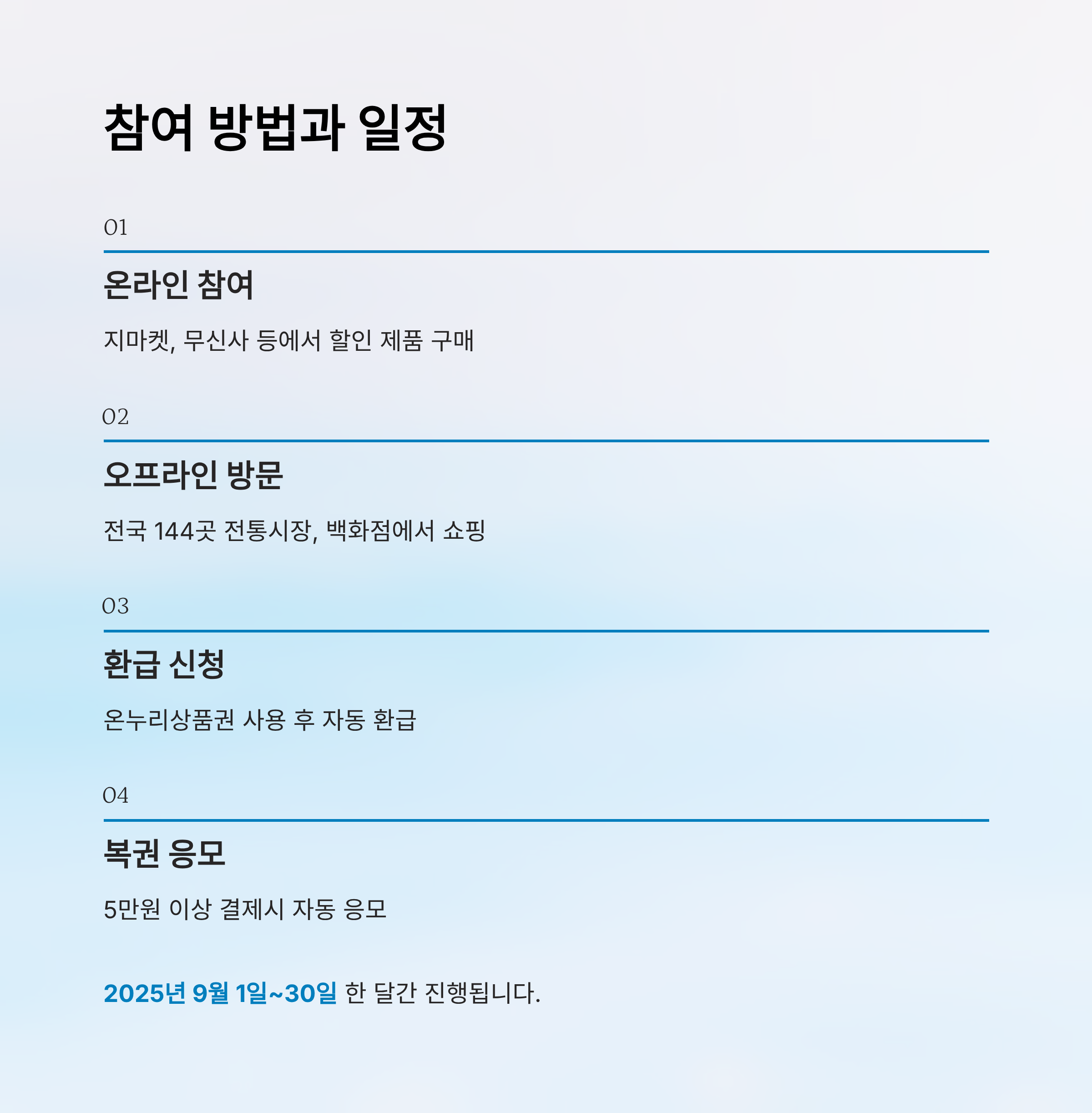 👉 2025년 9월 1일부터 30일까지 한 달 동안 진행돼요. 온라인 쇼핑몰(지마켓, 무신사 등)뿐 아니라 전국 144곳의 전통시장·야시장·백화점·동네슈퍼에서 오프라인 행사도 열립니다.