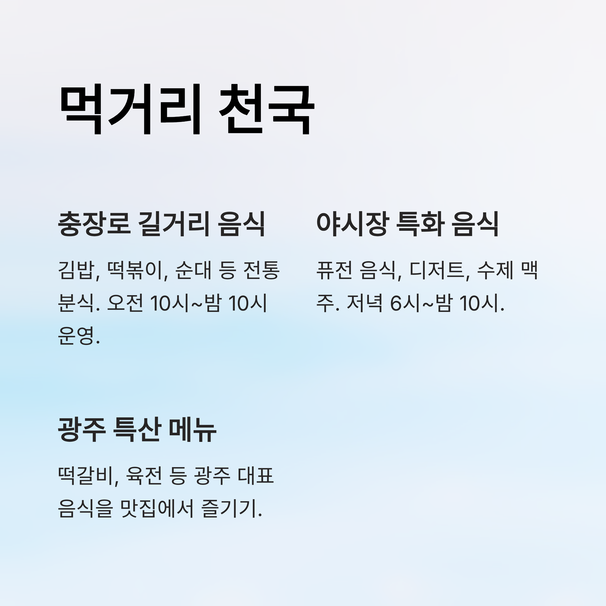 저녁 식사는 충장로의 전통 맛집이나 길거리 음식으로 해결하면 좋아요. 김밥, 떡볶이, 순대부터 광주 특산물인 떡갈비와 육전까지 다양하게 즐길 수 있어요. 야시장에서 퓨전 음식과 아시아 푸드도 체험 가능해요.