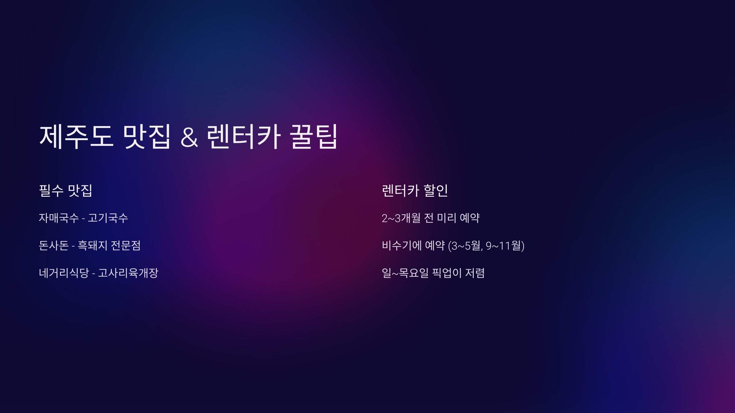 제주는 초보 여행자도 쉽게 즐길 수 있는 아름다운 자연과 다양한 명소로 가득한 섬입니다. 이 가이드는 초보 여행자들을 위해 주요 관광지, 맛집, 이동 팁, 그리고 완벽한 제주 여행 코스를 제