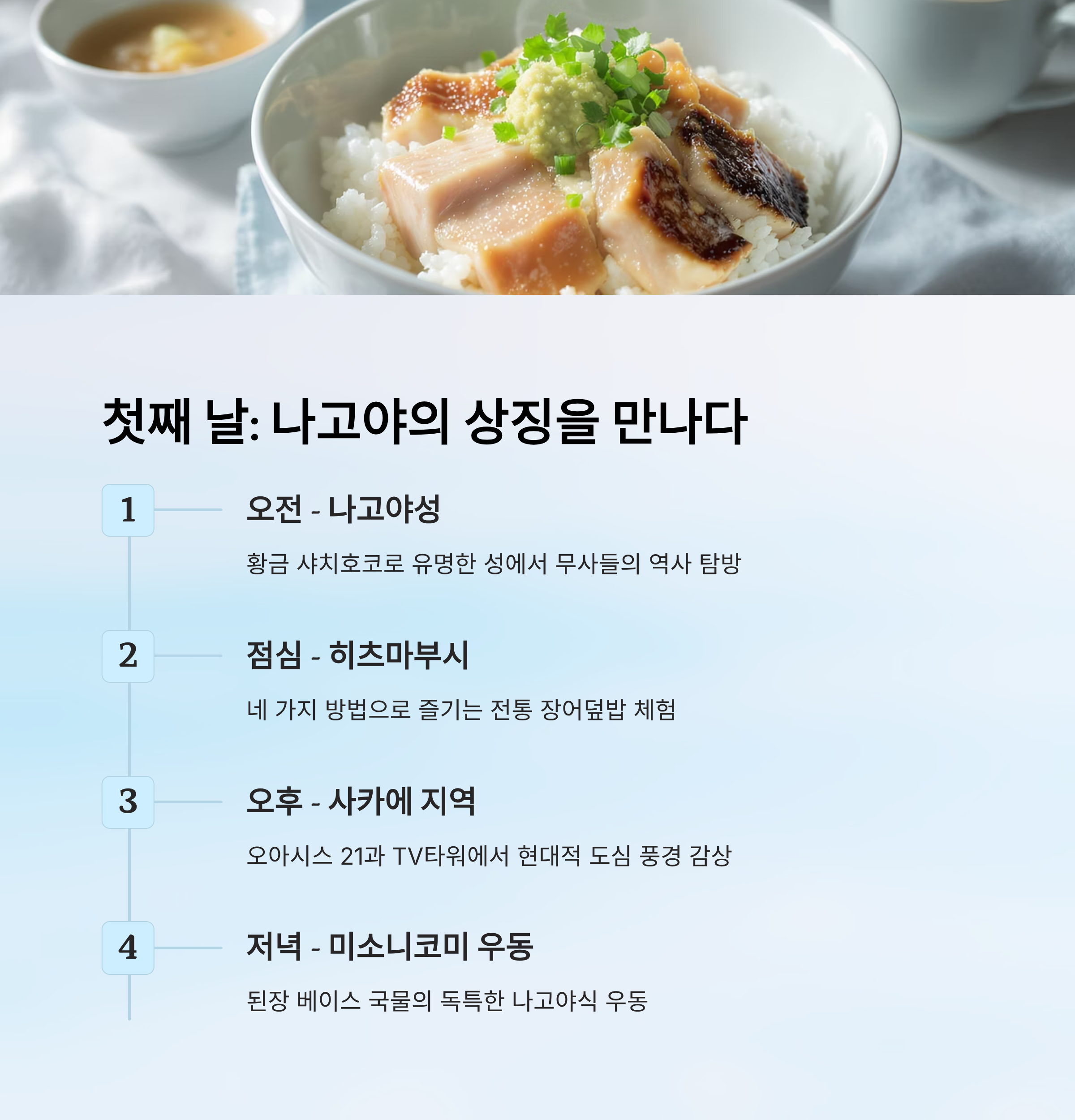 첫째 날은 나고야의 대표 명소와 먹거리를 중심으로 동선을 잡는 게 좋아요. 오전에는 나고야성에서 시작해 역사와 문화를 느낀 뒤, 오후에는 사카에 지역으로 이동해 쇼핑과 현대적인 분위기를 즐기는 일정이 알맞답니다. 저녁에는 현지인들이 추천하는 나고야 특유의 요리를 맛보면서 하루를 마무리하면 딱이에요.