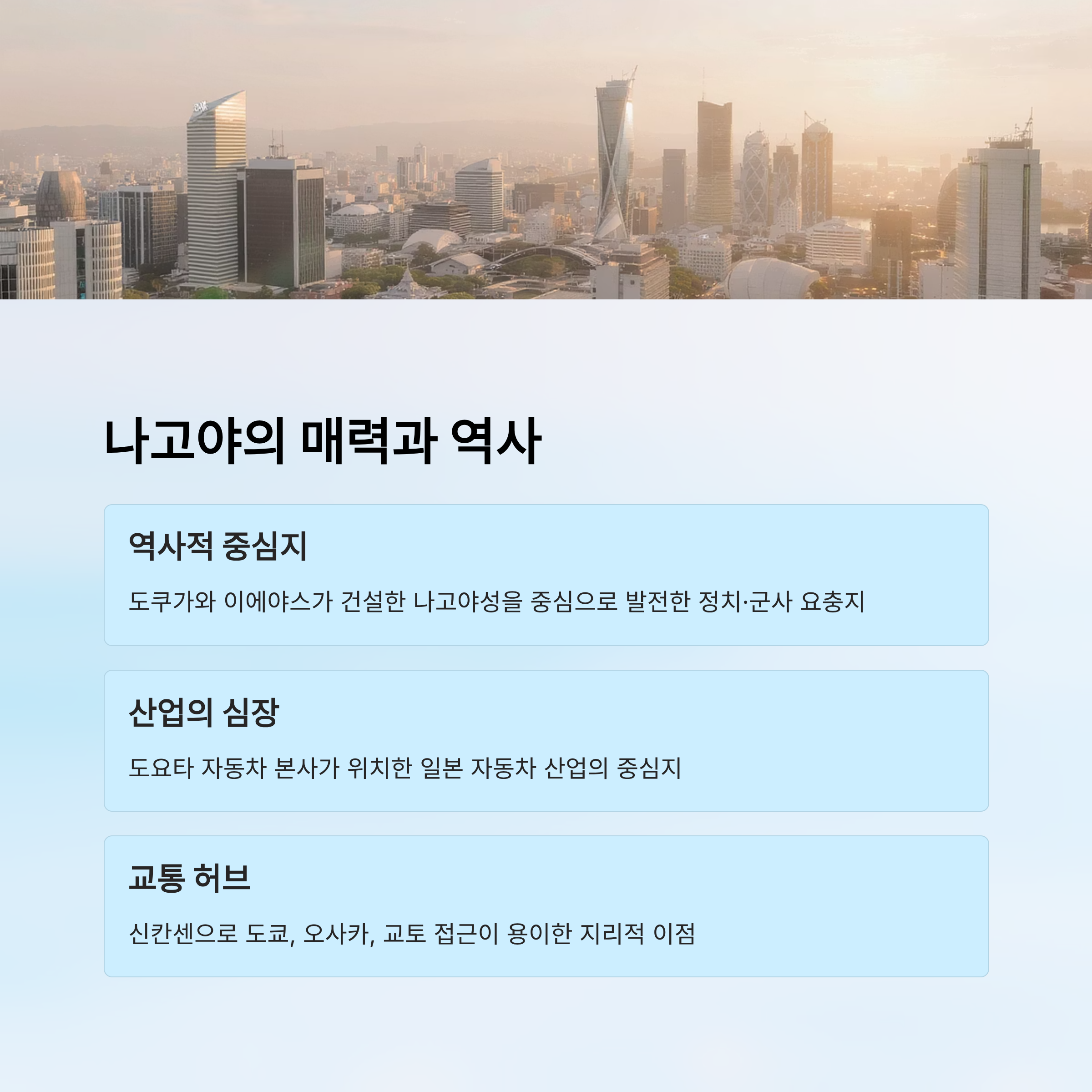 나고야는 일본의 네 번째로 큰 도시이자 아이치현의 중심지로, 전통과 현대가 어우러진 독특한 매력을 가지고 있어요. 2025년 현재, 나고야는 쇼핑, 미식, 역사 탐방, 근교 여행까지 한 번에 즐길 수 있는 여행지로 각광받고 있답니다.