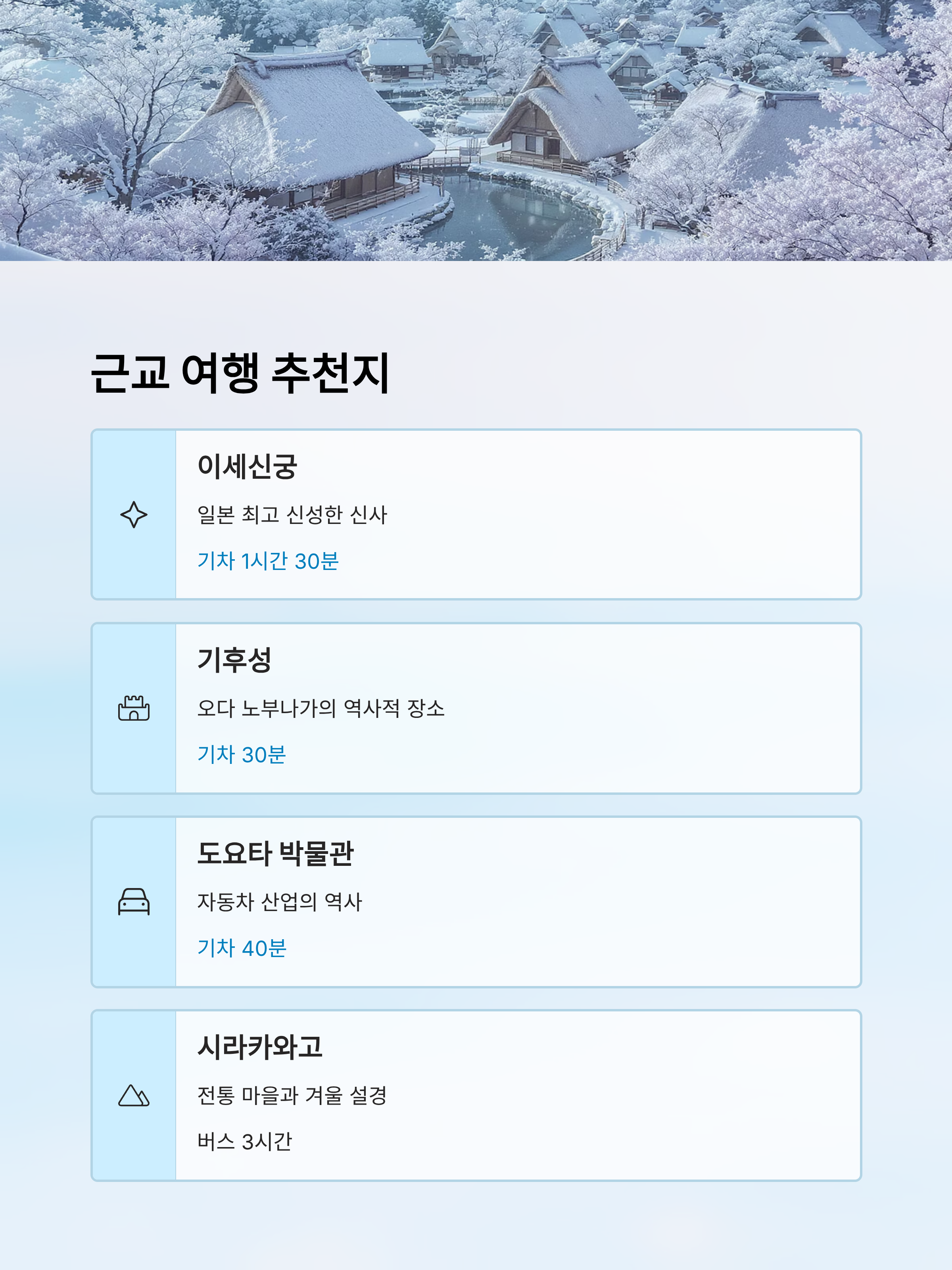 나고야를 거점으로 잡으면 다양한 근교 도시를 빠르게 다녀올 수 있어요. 교통편이 편리해 짧은 일정에도 알찬 여행을 즐길 수 있답니다. 기차나 버스를 이용해 1~2시간이면 도착할 수 있는 명소들이 많아 여행자들에게 인기예요.