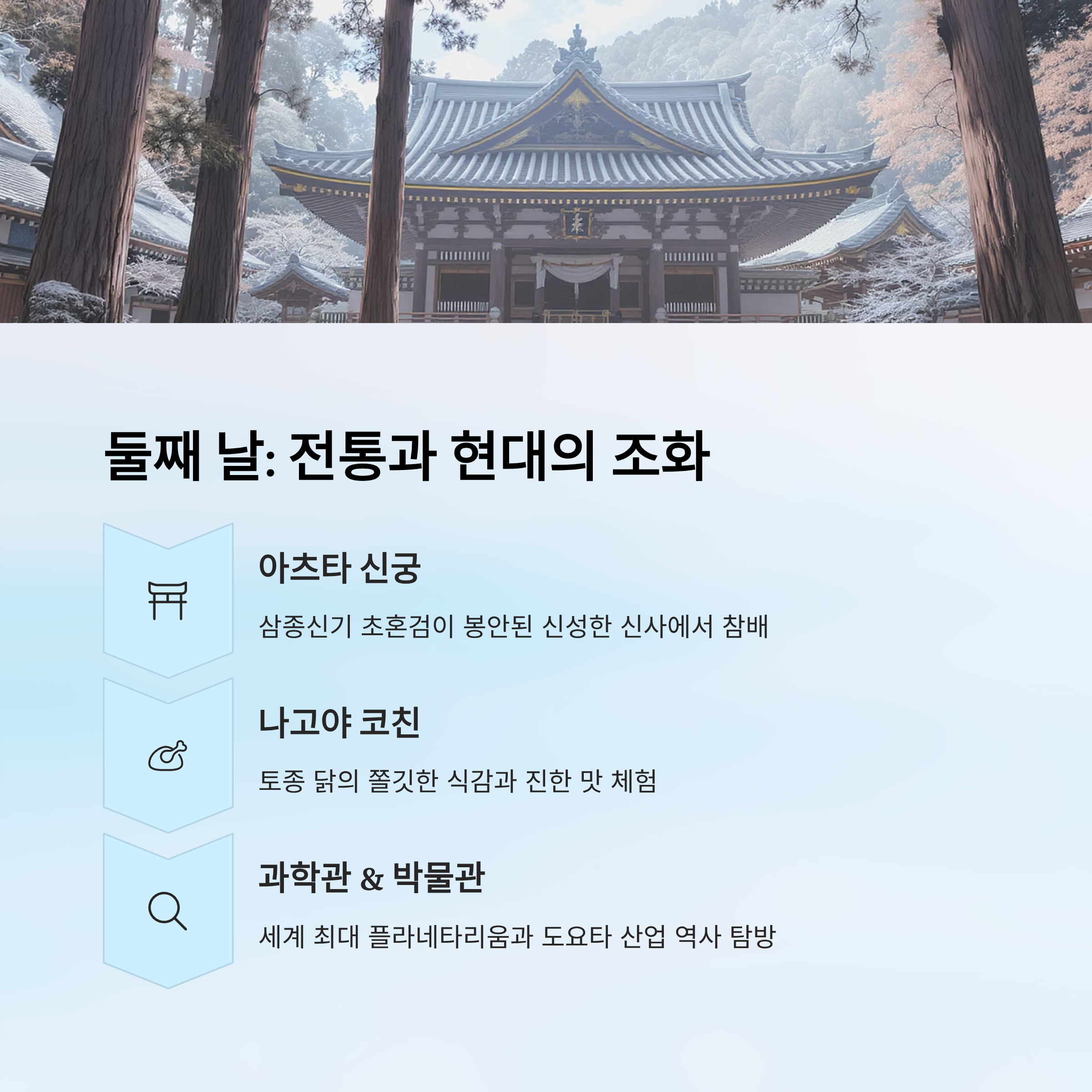 둘째 날은 나고야의 전통과 현대를 동시에 체험할 수 있는 일정으로 짜는 게 좋아요. 아침에는 아츠타 신궁에서 고즈넉한 분위기를 느끼고, 점심은 명물 음식으로 배를 채운 뒤 오후에는 박물관과 과학관에서 문화와 지식을 즐기는 코스를 추천해요. 저녁에는 나고야역 주변에서 가볍게 쇼핑을 하면서 마무리하는 일정이 딱이랍니다.