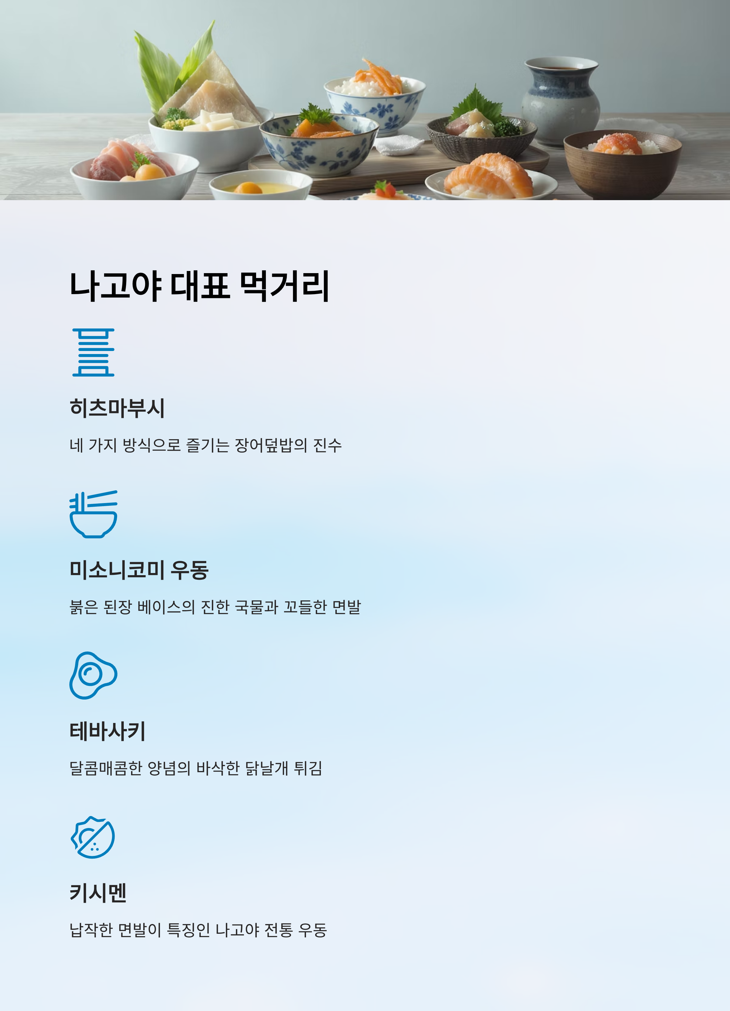 나고야 여행에서 빼놓을 수 없는 건 바로 독특한 음식 문화예요. 일본 다른 도시와는 달리 나고야는 진한 맛과 개성 있는 요리들이 많아 ‘나고야 메시’라고 불릴 정도로 유명하답니다. 여행 기간 동안 다양한 음식을 맛보면 더 풍성한 추억을 남길 수 있어요.
