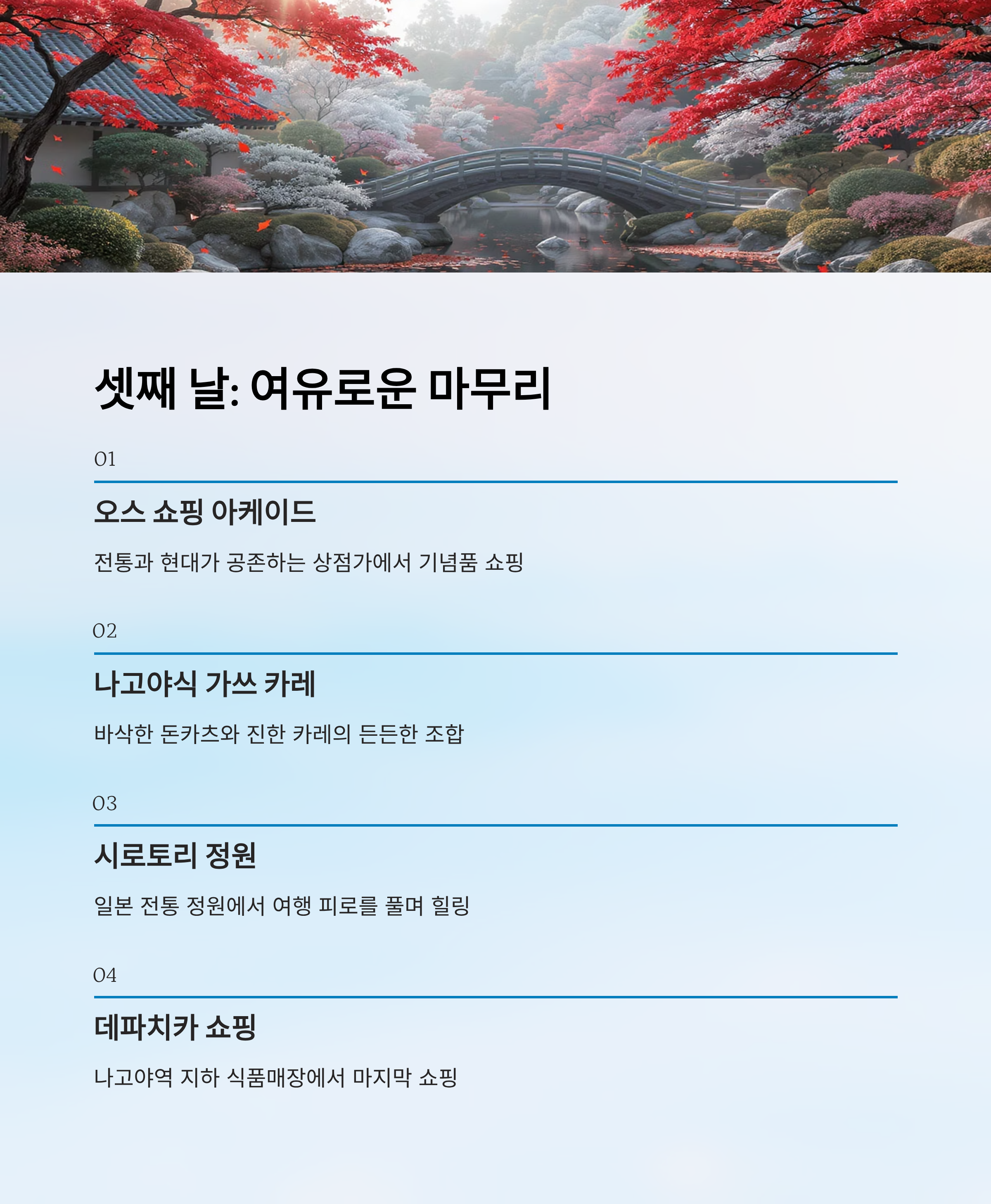 셋째 날 코스는 나고야의 다양한 모습을 여유롭게 담을 수 있는 일정이에요. 여행의 마지막을 편안하게 마무리하면서도 ‘나고야스러움’을 잊지 않게 해주는 하루라 만족도가 높답니다. 🍵